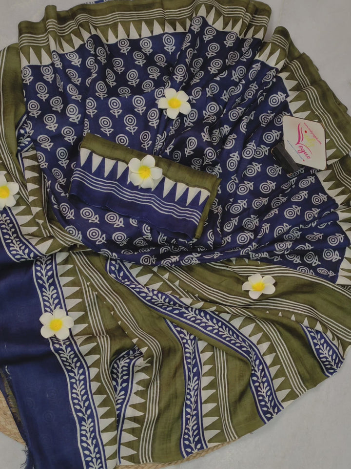 This stunning blue color pure Bishnupur Silk saree is a must-have addition to your wardrobe. Adorned with delicate hand block prints on the classic blue body with geometric block print work.