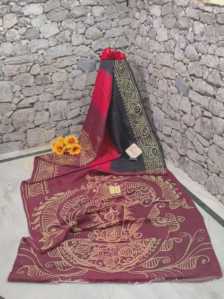 There’s something utterly captivating about this Pure Bishnupuri Silk Saree — it’s where tradition meets bold artistry. Draped in luxurious silk, this beauty features Kalka Batik work all over, hand-drawn with love and precision by Bengal’s skilled artisans. What truly steals the show is its tricolor hand-dye magic — a mesmerizing blend of red, black, and brown wine hues that dance together in perfect harmony.