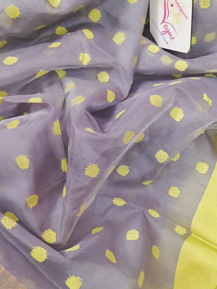 Pure Chanderi Banarasi Silk Saree in Grey and Yellow Color with Thread Weaving Buti and Mashru Border