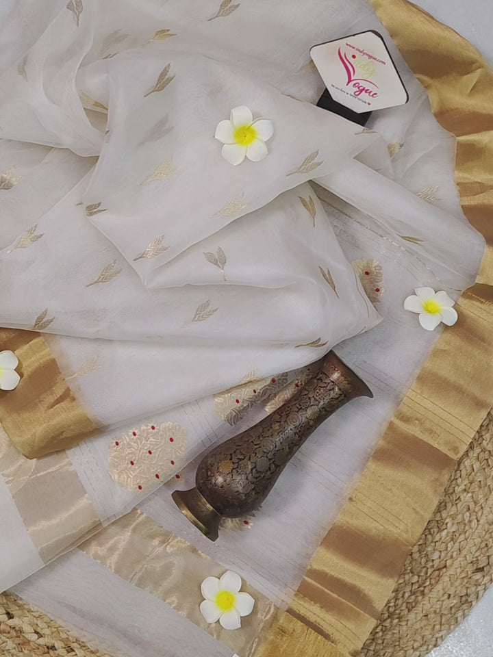 Pure Chanderi Banarasi Silk Saree in Offwhite Color with Golden Zari Border and Butta Work Allover
