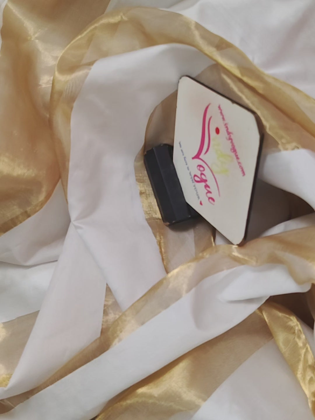 The body glows with a soft shimmer, while the zari and tissue weaving on the pallu in an alternative linear pattern adds a modern yet traditional charm. The subtle contrast of golden tones on pristine white creates a look that’s both classic and contemporary, perfect for festive occasions, celebrations, or elegant gatherings.