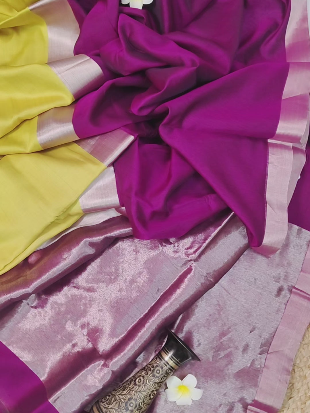 Pure Chanderi Silk Saree in Deep Violet and Lemon Yellow Color with Mashru Silk Border