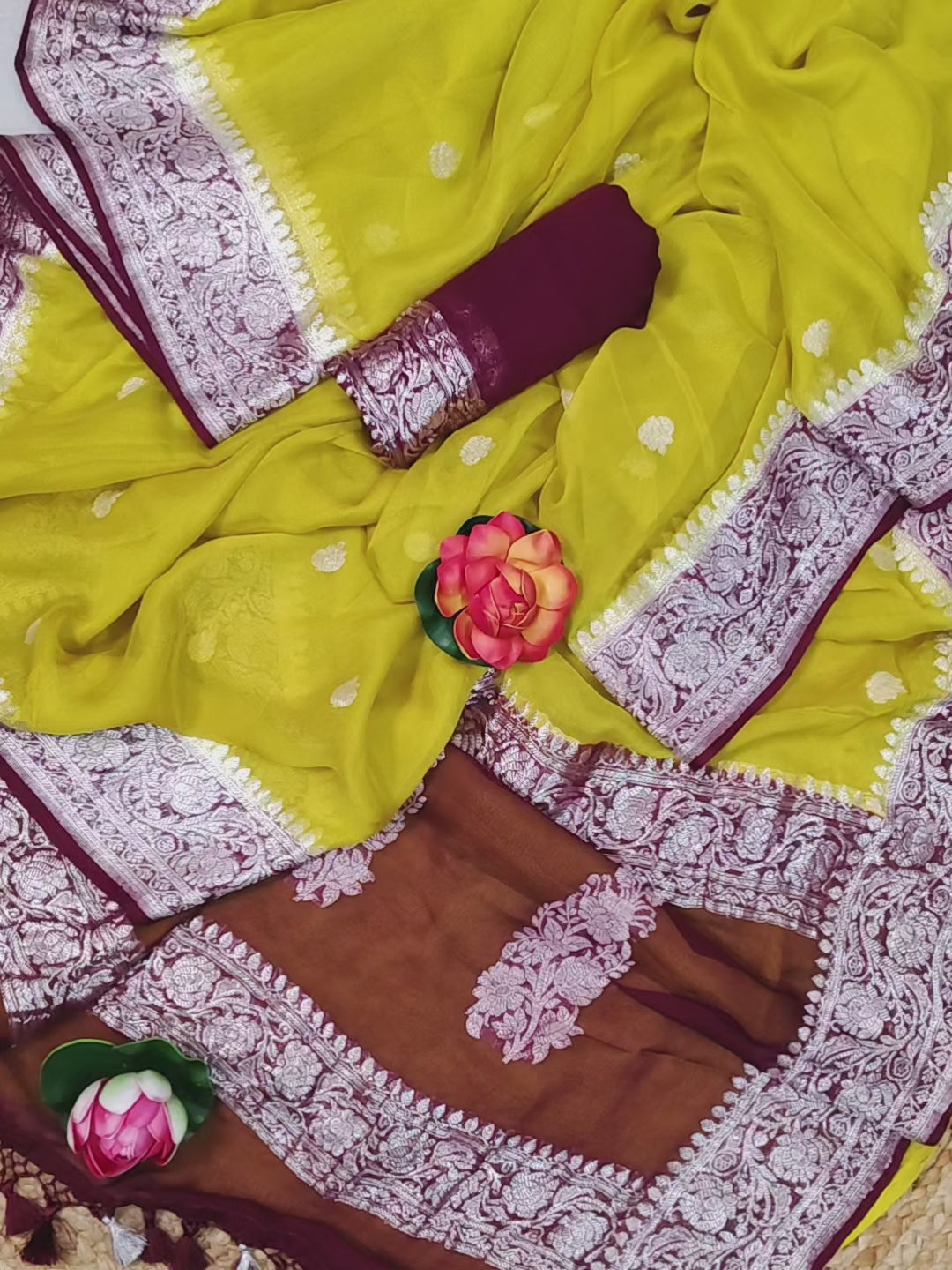 Elevate your everyday elegance with this stunning Pure Chiffon Banarasi Saree, where sunshine-bright lemon yellow meets deep wine tones in perfect harmony. Adorned with intricate all-over silver zari butta work and a gleaming zari border, this piece whispers luxury with every movement.
