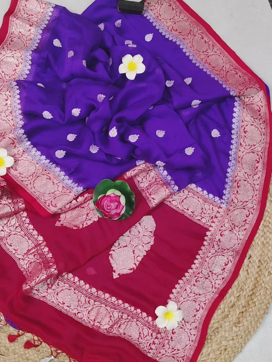 Pure Chiffon Banarasi Silk Saree in Purple and Red Color with Silver Zari Work Allover