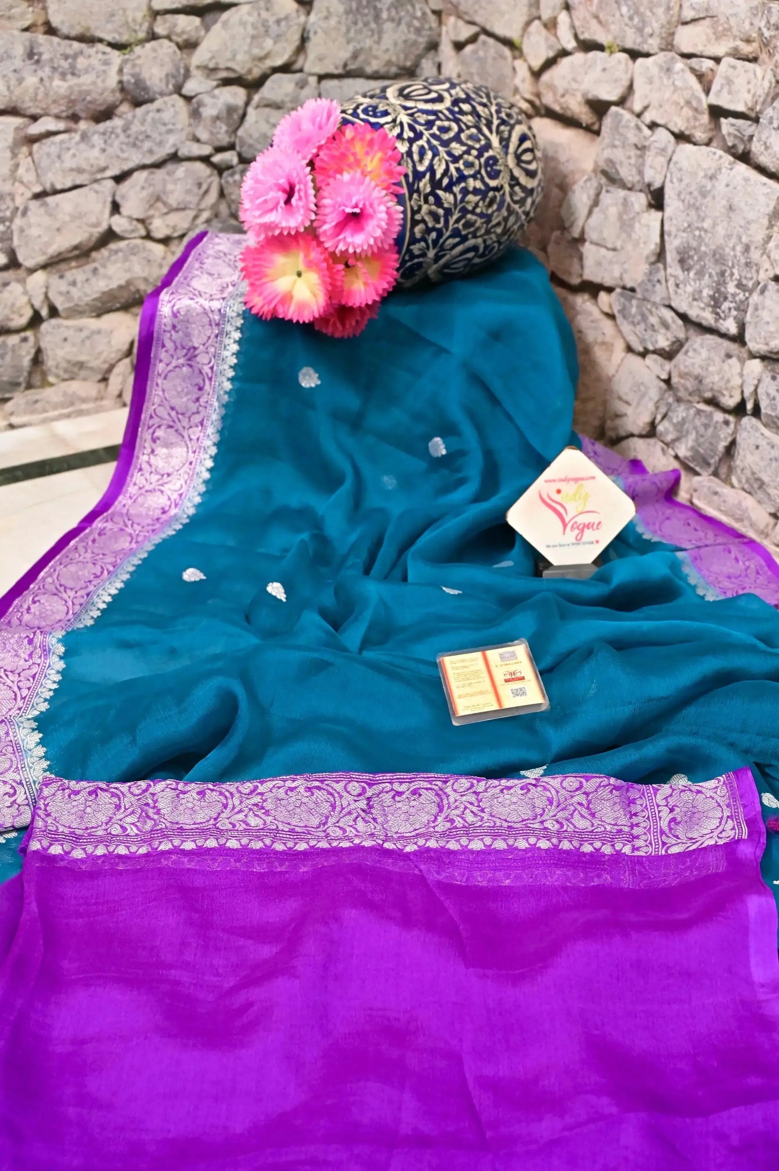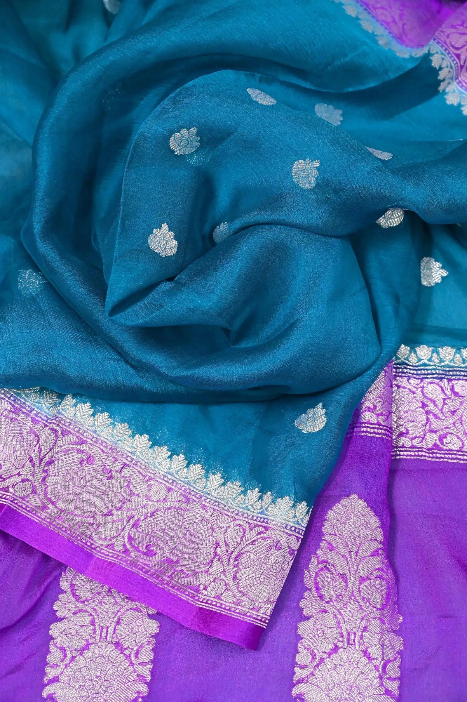 - This is a blue and purple dual-tone color saree that comes with an amazing silver zari butta work all over