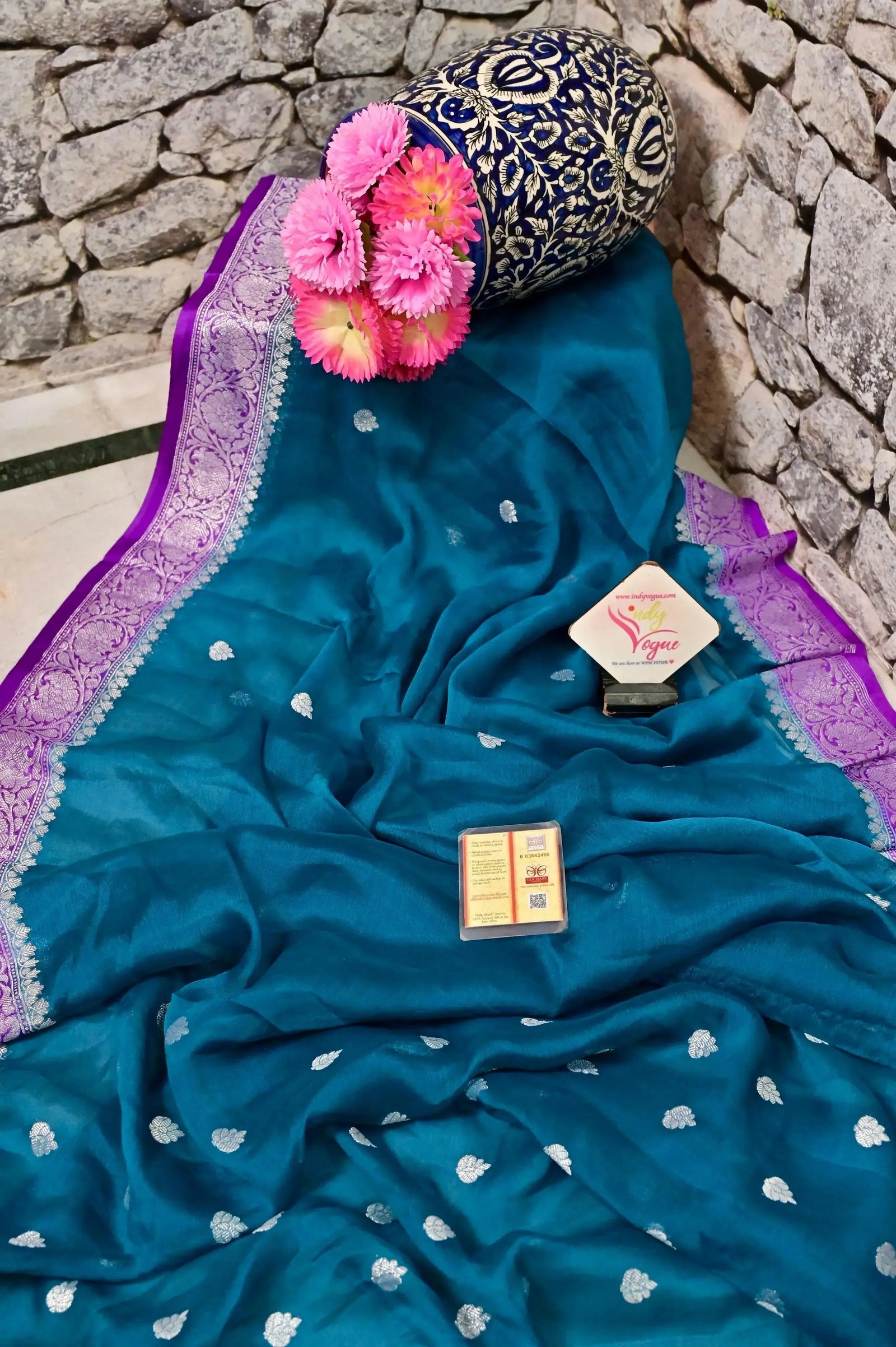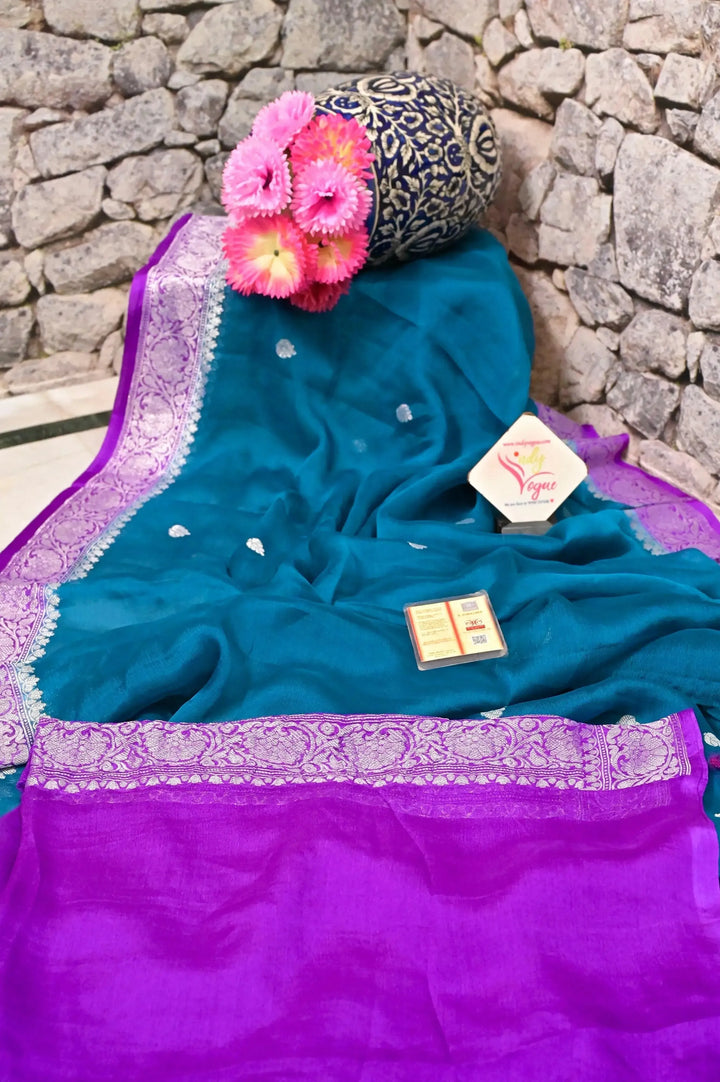 Pure Chiffon Saree in Blue and Purple Dual Tone Color with Allover Silver Zari Butta Work with Zari Border and Pallu