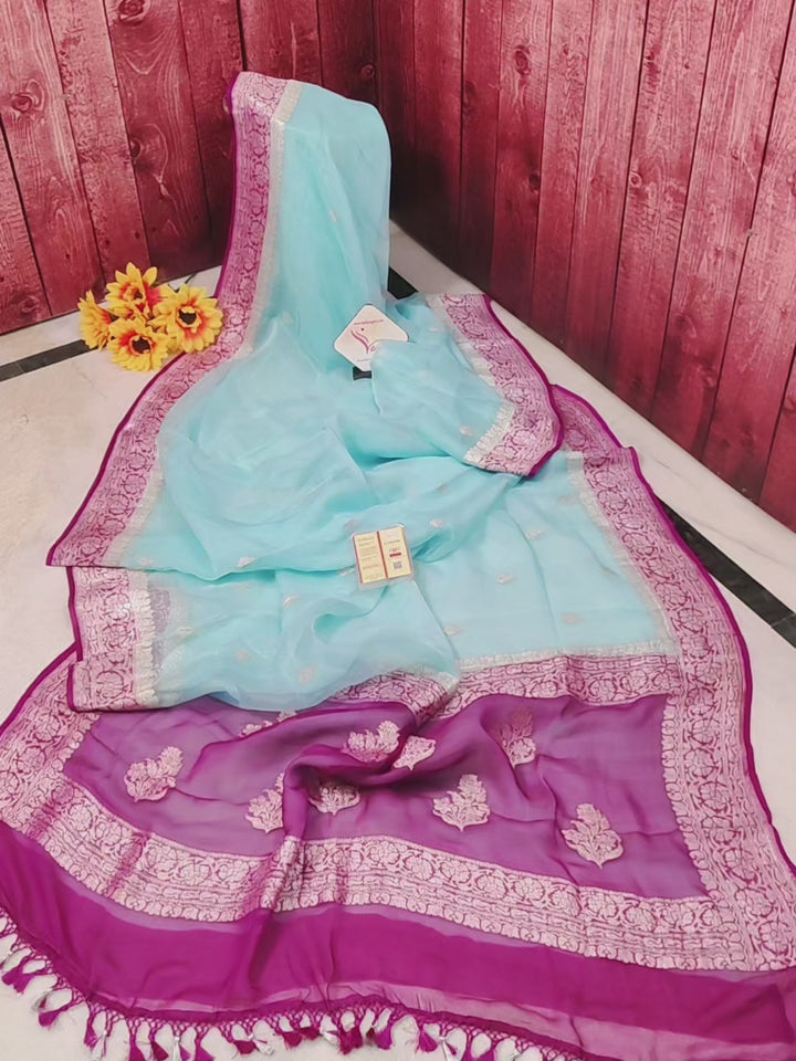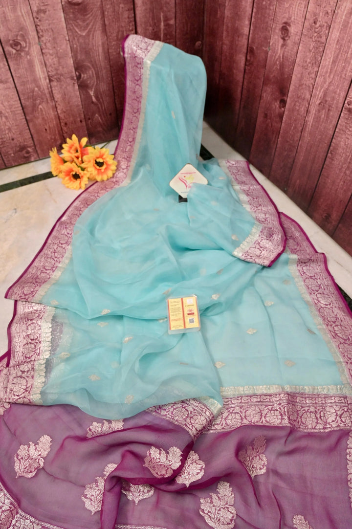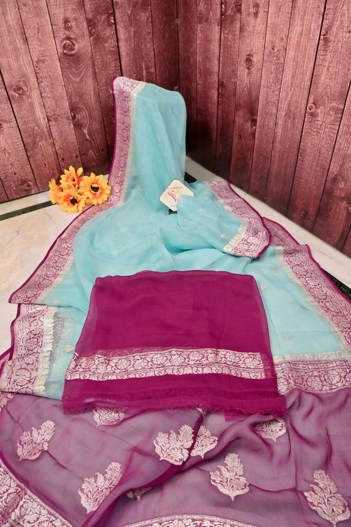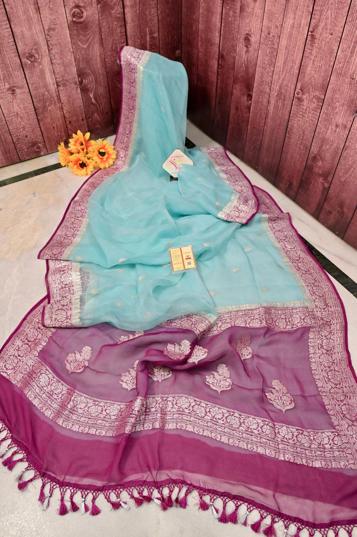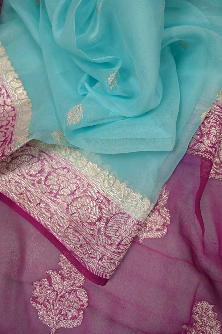 Pure Chiffon Saree in Light Blue and Purplish Magenta Color with Allover Silver Zari Butta Work with Zari Border and Pallu