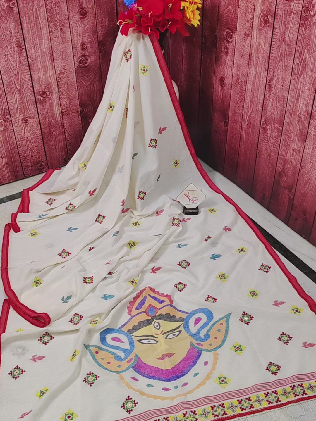 - Allover Jamdani's work and highlights a big Maa Durga face done through jamdani weaving