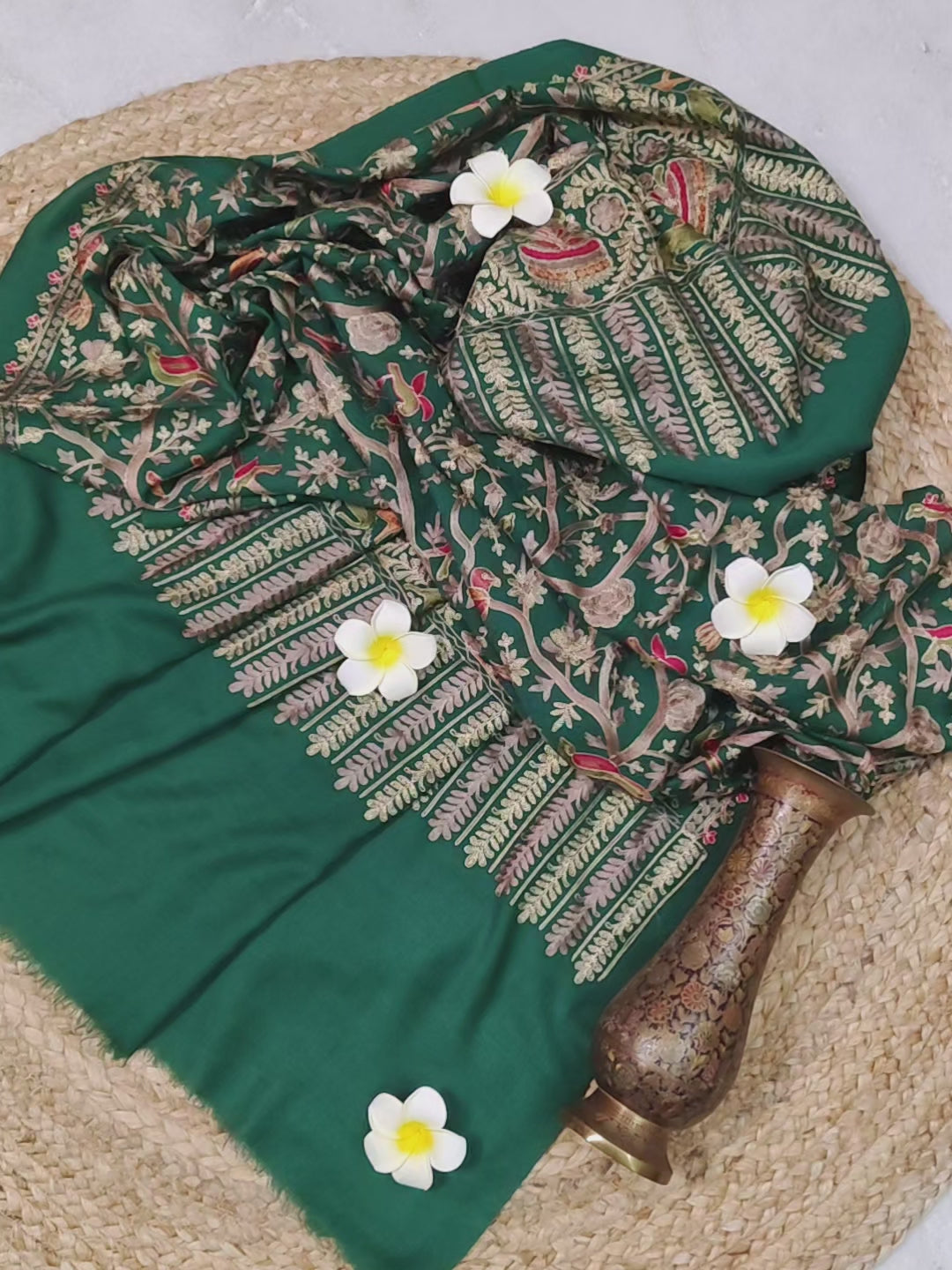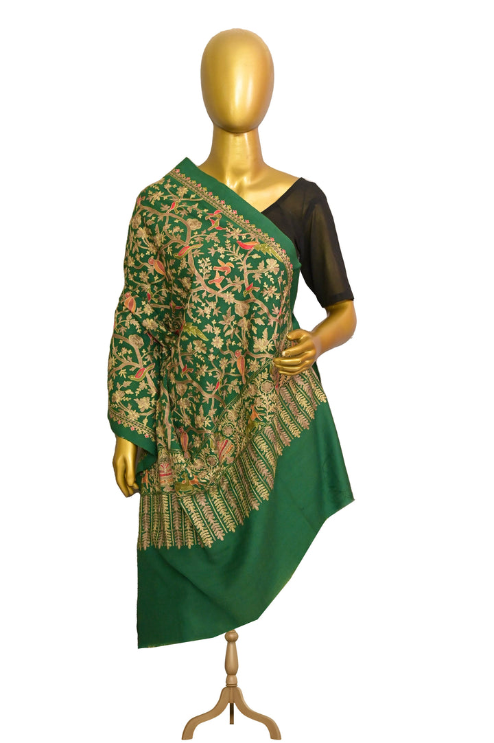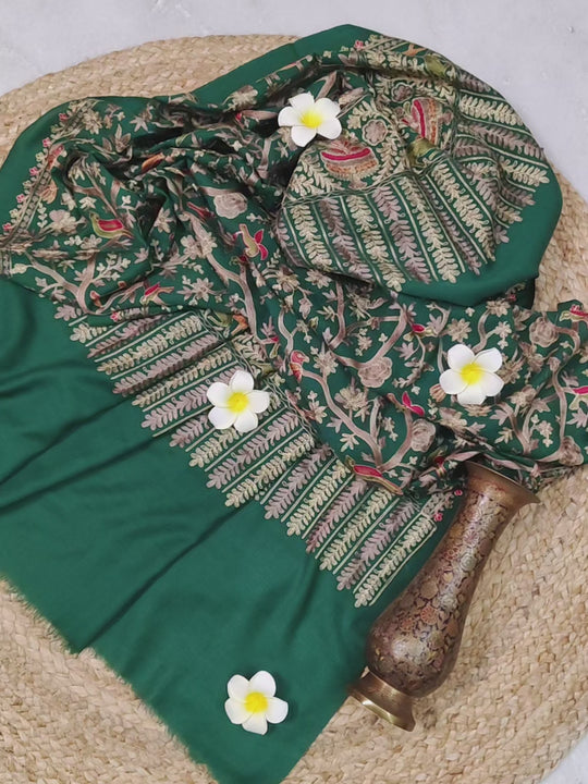 Elevate your winter style with this stunning green Pashmina shawl, woven from pure fine wool for unmatched softness and comfort. The exquisite ari bird design brings a touch of nature-inspired elegance, making the piece both artistic and timeless. Light, warm, and effortlessly classy, this shawl drapes beautifully over any outfit — perfect for evening gatherings, travel, or cozy everyday layering. A blend of craftsmanship and charm, it’s a must-have accessory for those who adore refined winter fashion.