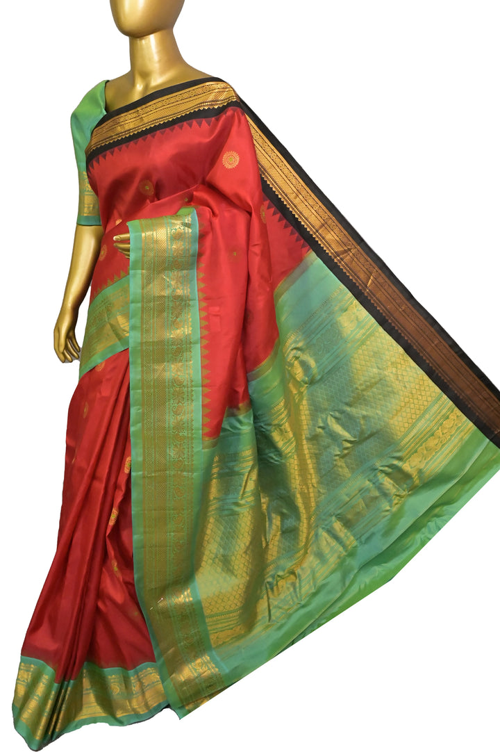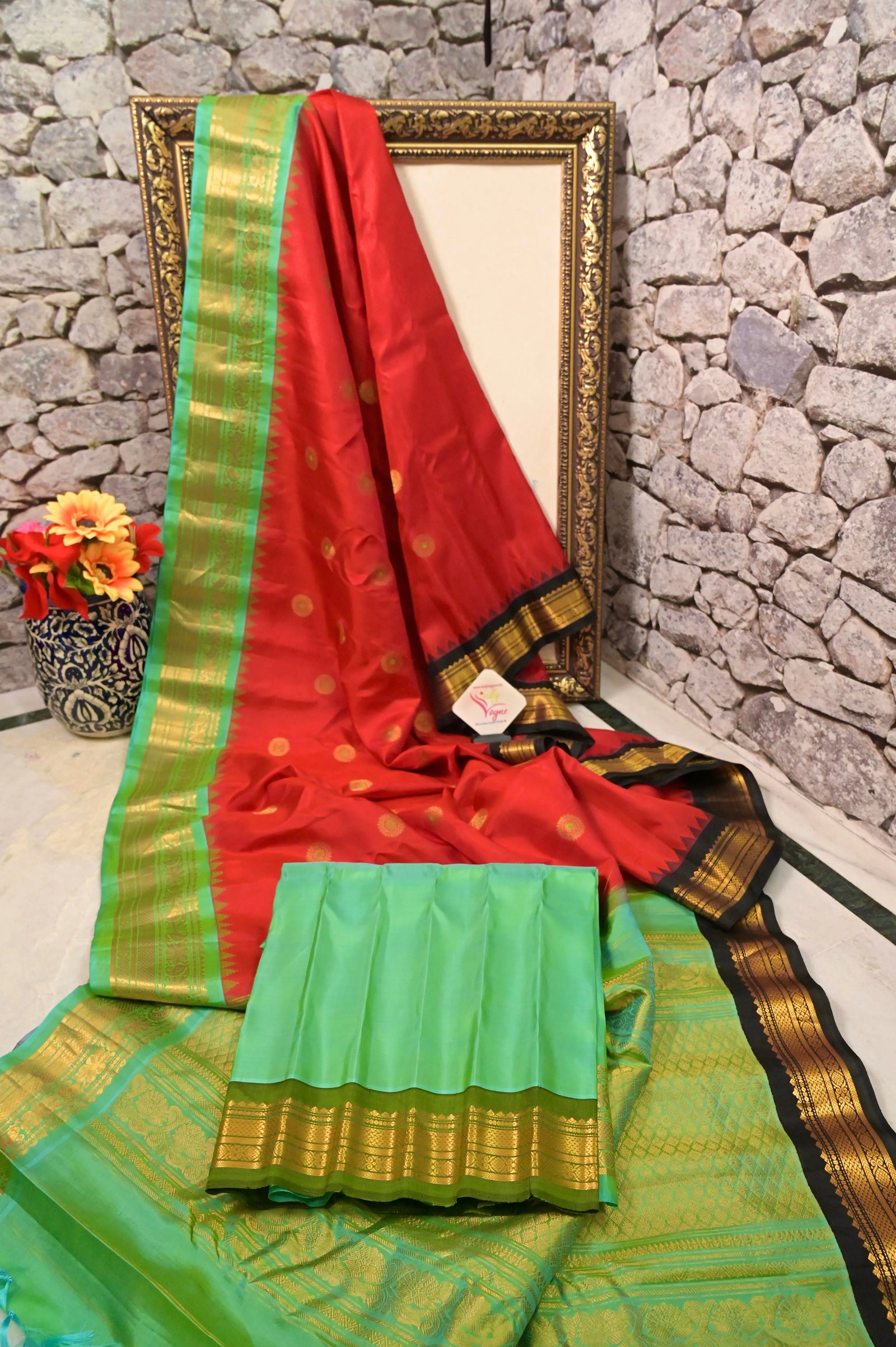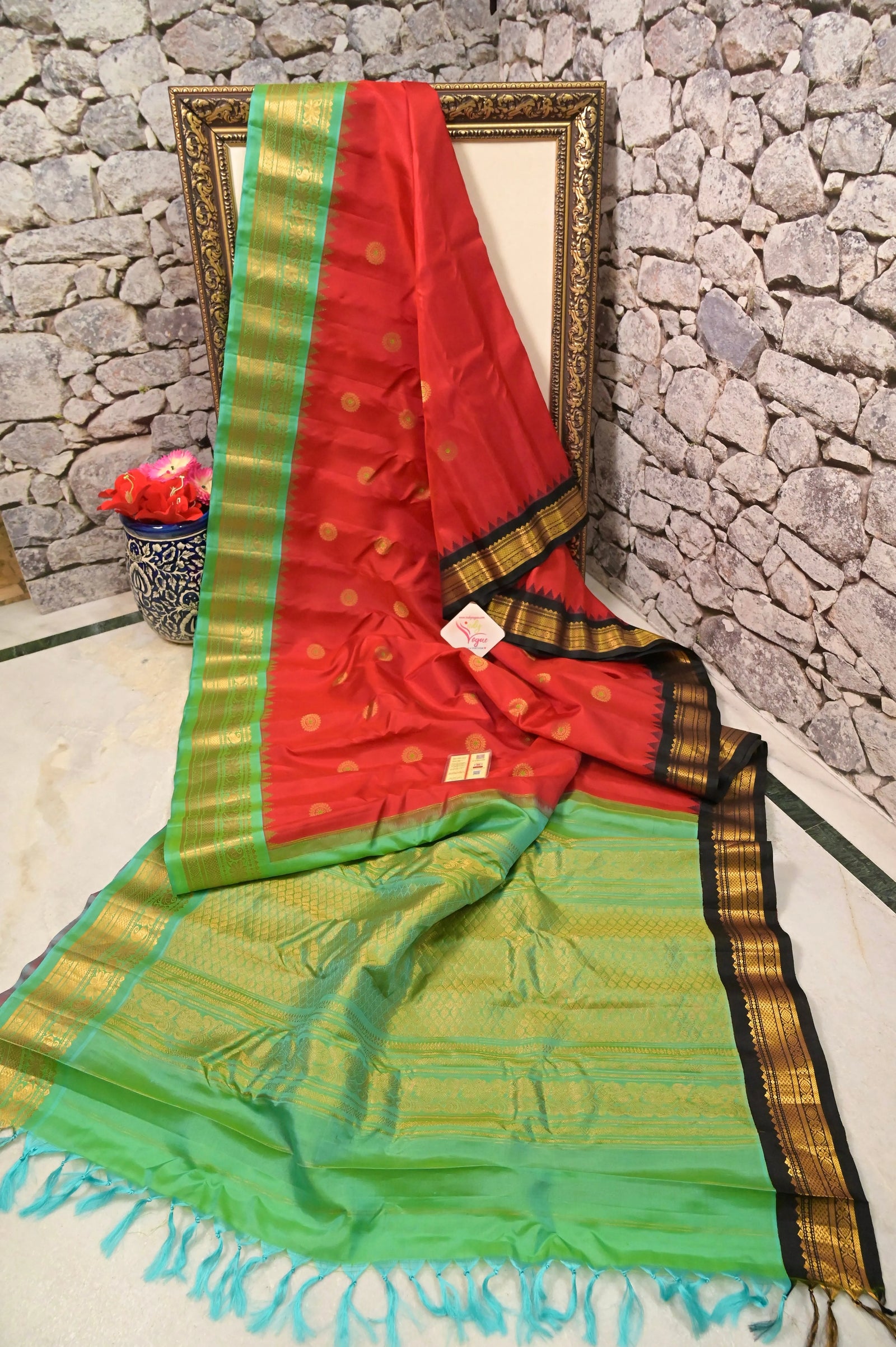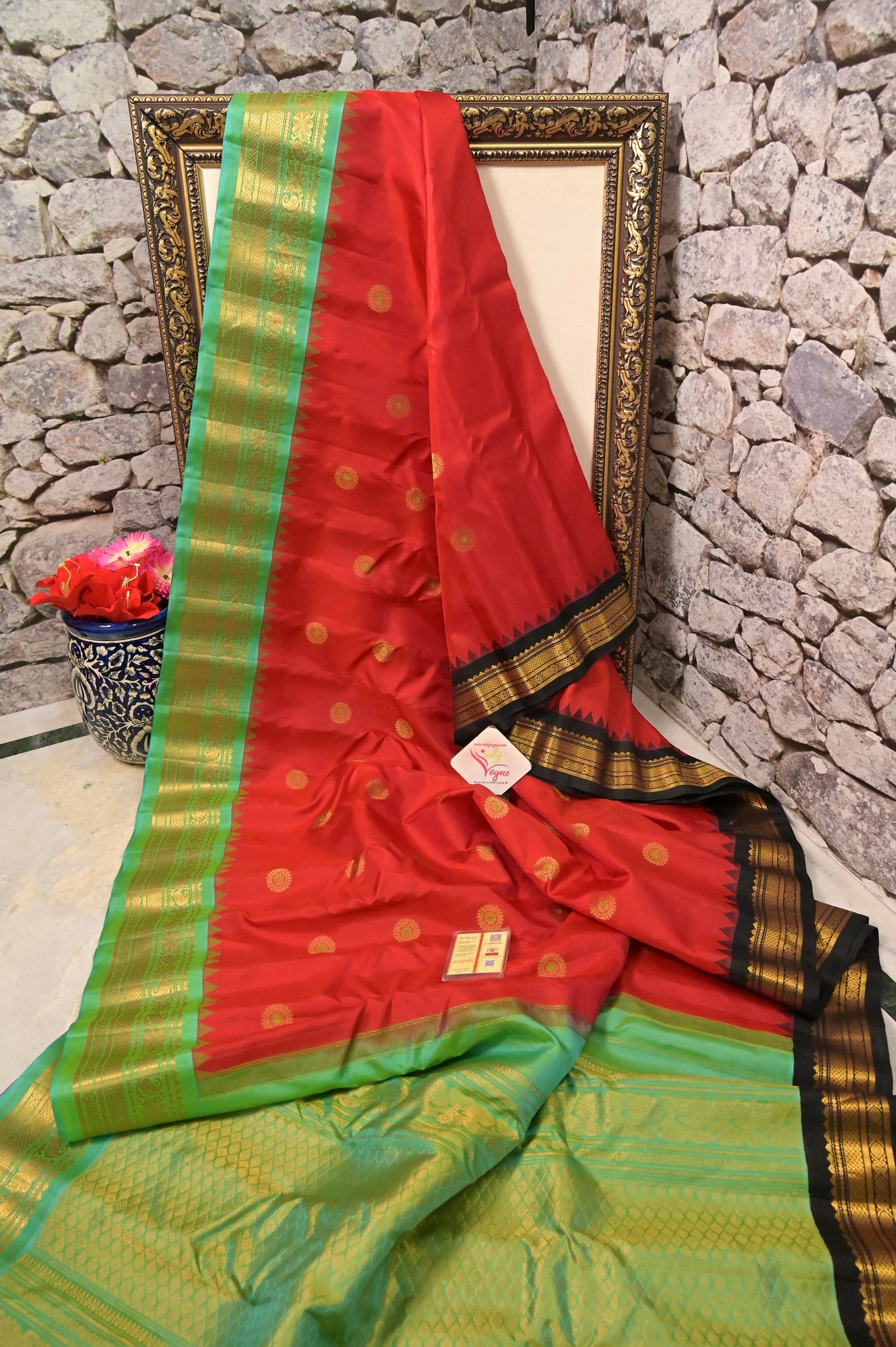 Pure Gadwal Silk Saree in Scarlet Red Color with Allover Meenakari Buti with Ganga Jamuna Zari Border