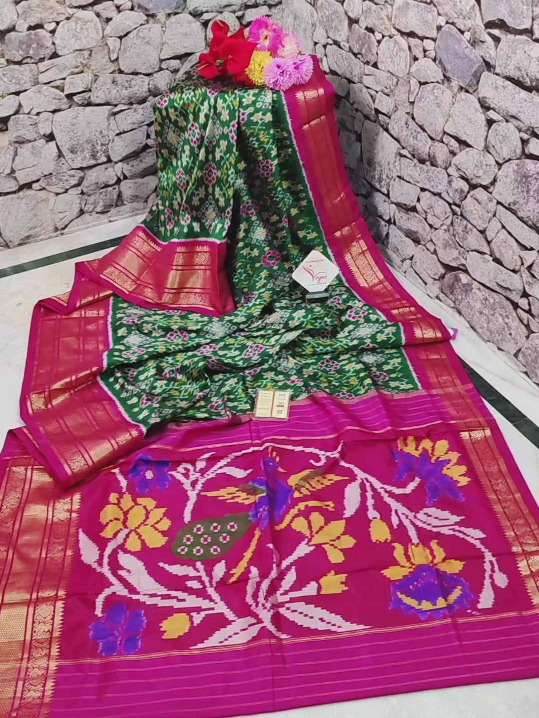 - Intricate all-over hand-woven ikat handloom work representing a geometric motif on the base body of deep green color to make it more luxurious