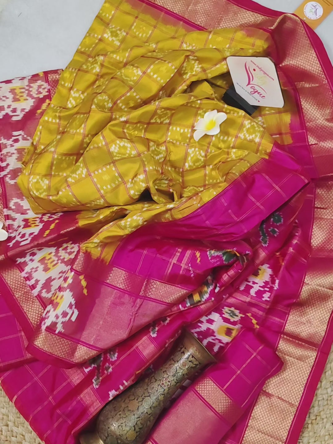Pure Ikat Silk Saree in Golden Yellow and Magenta Color with Check Body with Ikkat Weaving and Zari Work