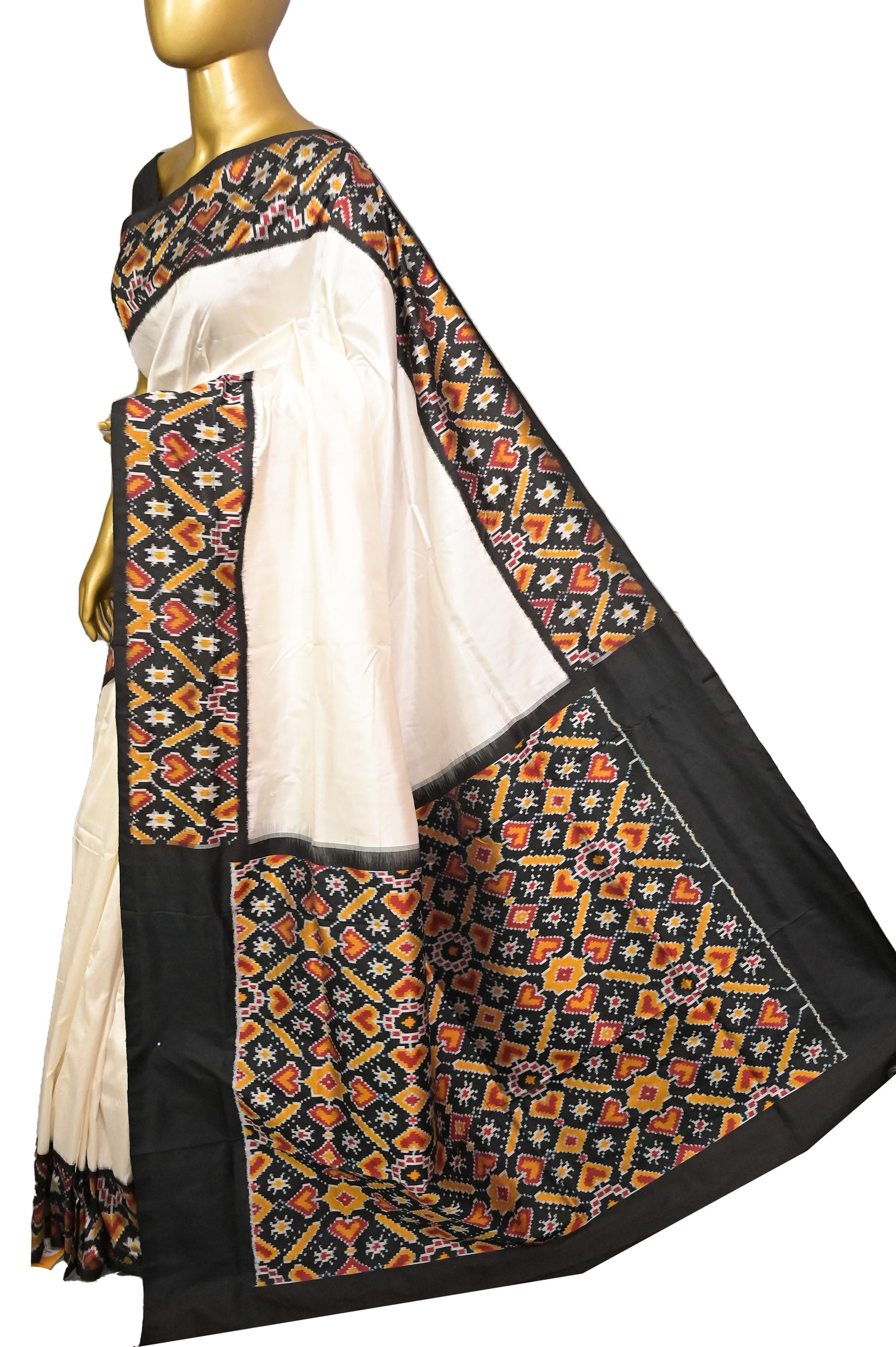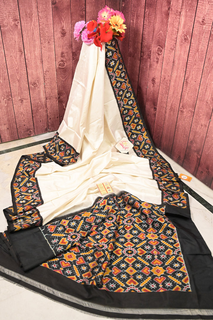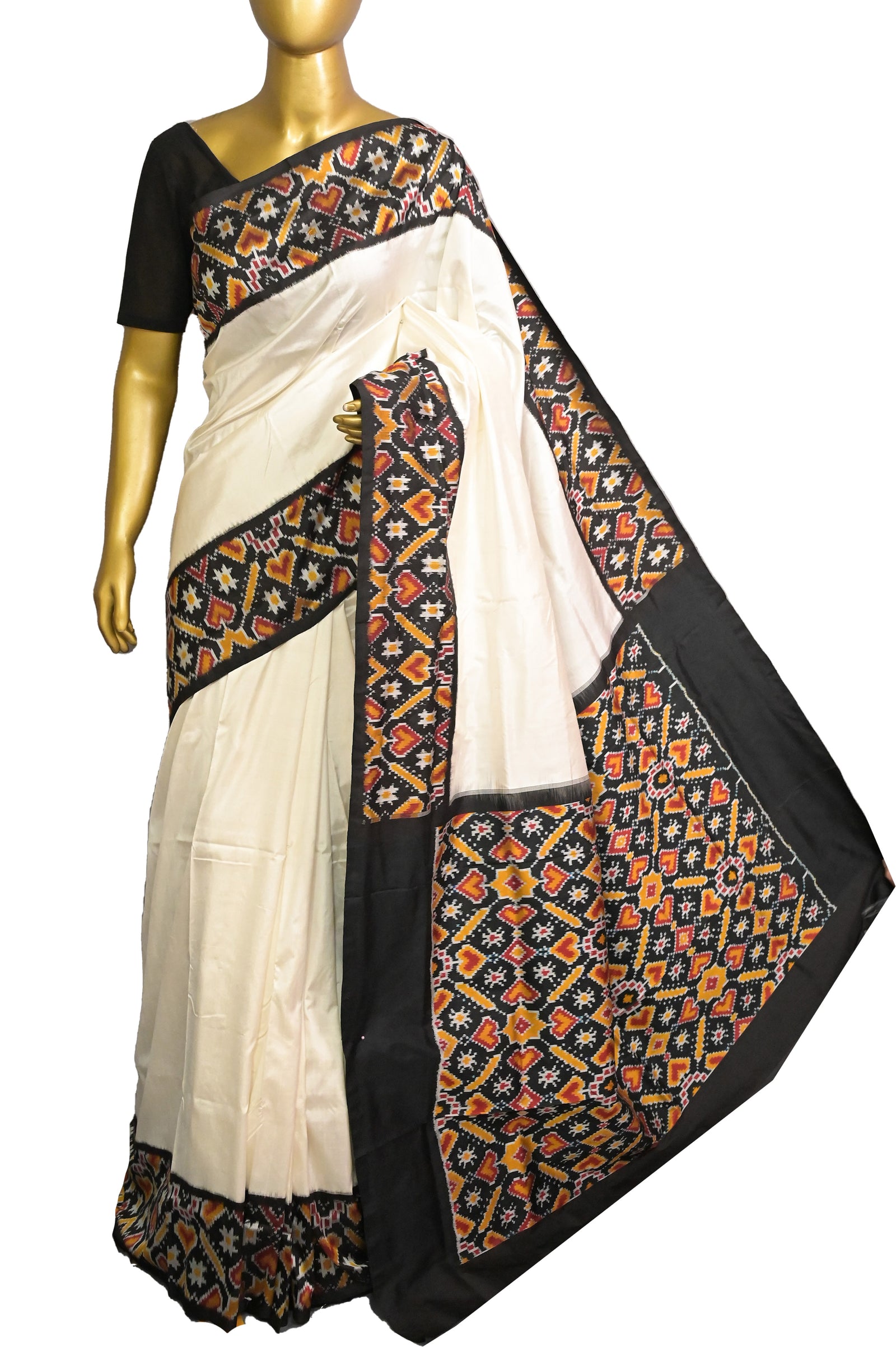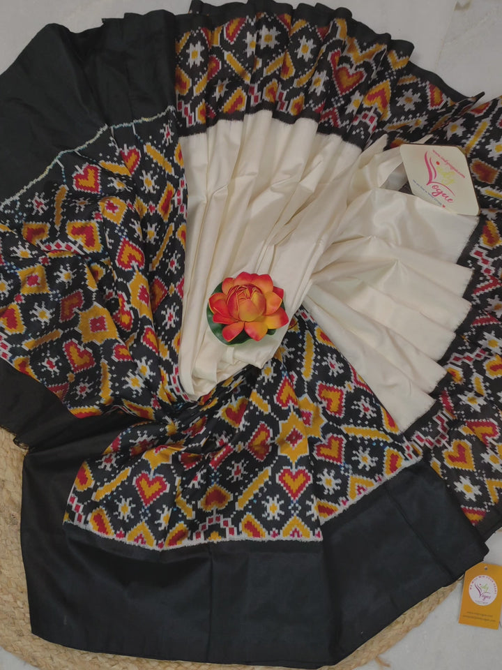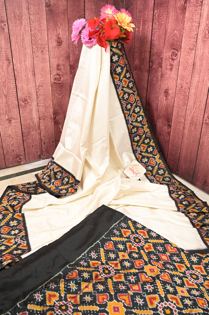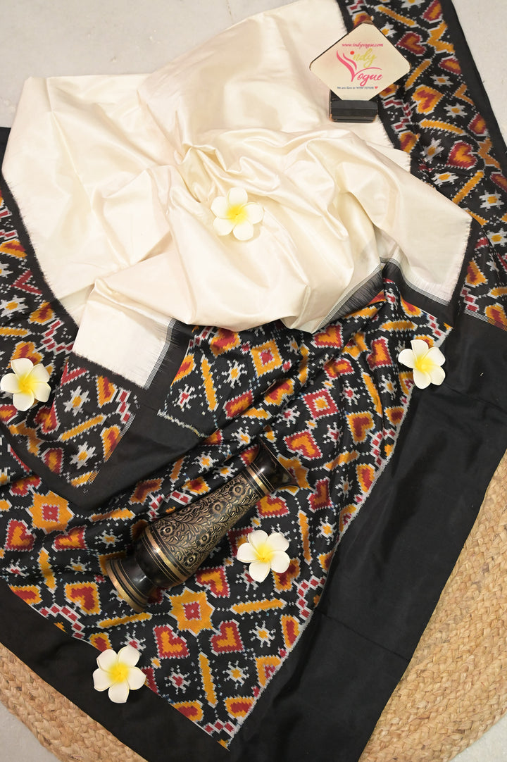 Pure Ikat Silk Saree in Offwhite Color Plain Body with Multicolored Ikat Design Border and Pallu