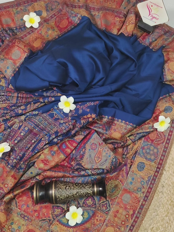 Who thought sarees could be this tempting? Introducing our Kani Silk Saree in a lovely navy blue color—soft, smooth, and absolutely enchanting. Featuring intricate thread and zari weaving inspired by the classic Kashmiri Pashmina style, this six-yard masterpiece is wearable art.
