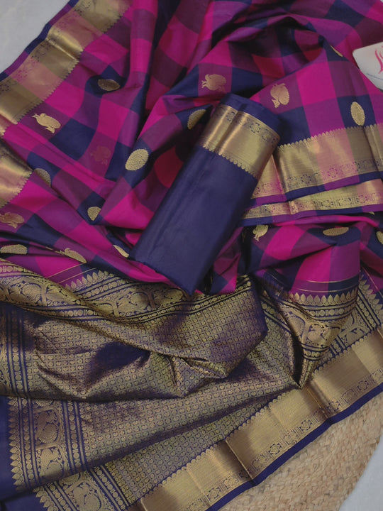 Pure Kanjeevaram Silk Saree in Magenta and Navy Blue Allover Butta with Multicolored Checks and Antique Golden Zari Work