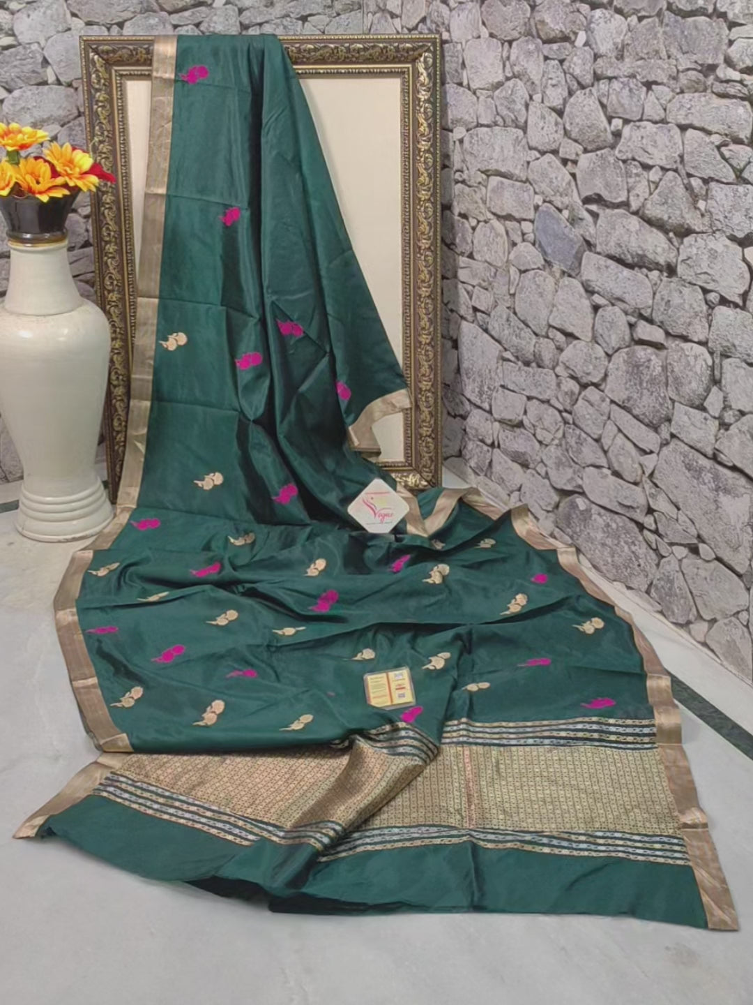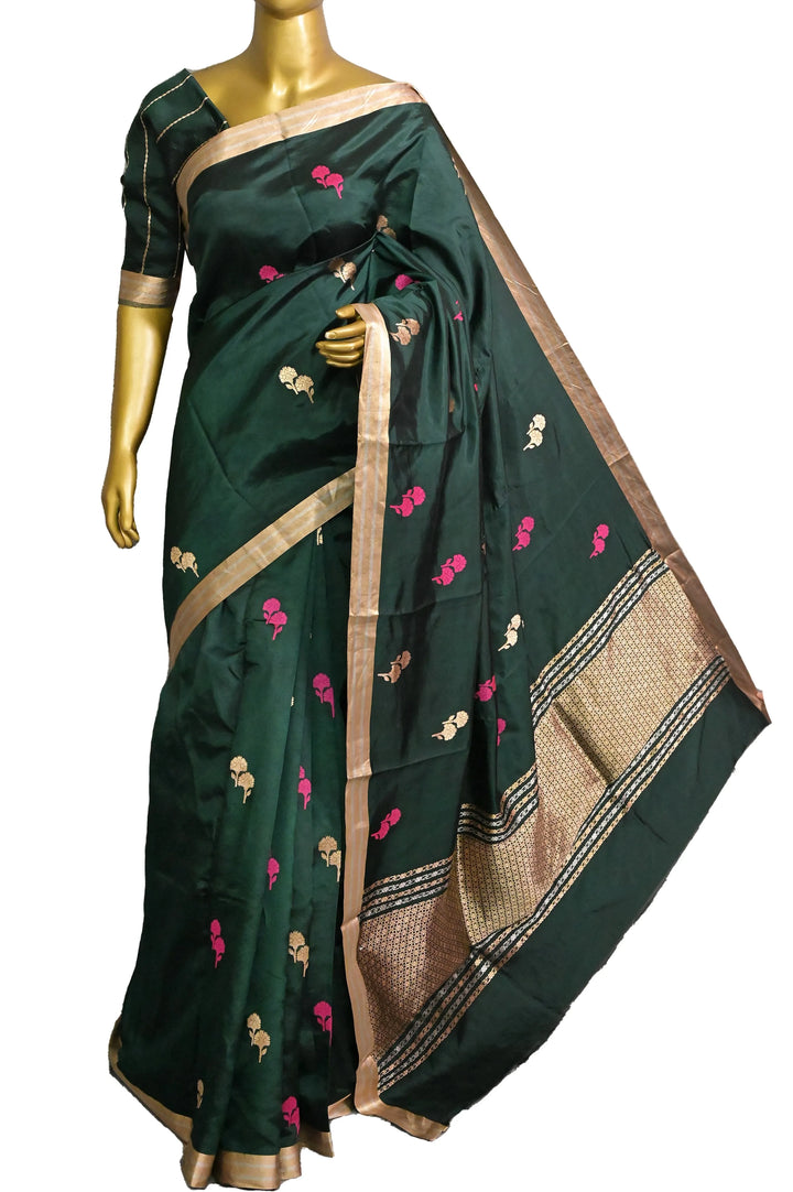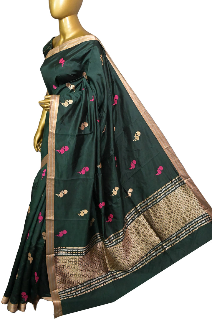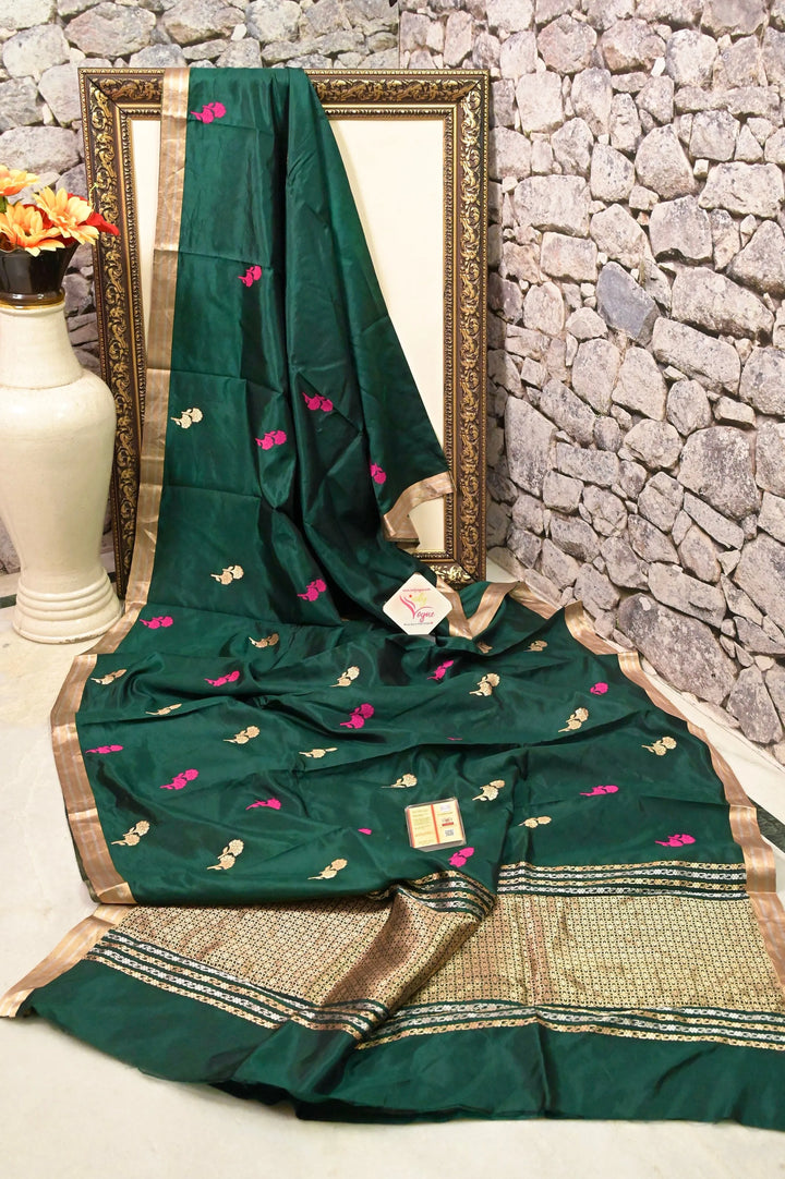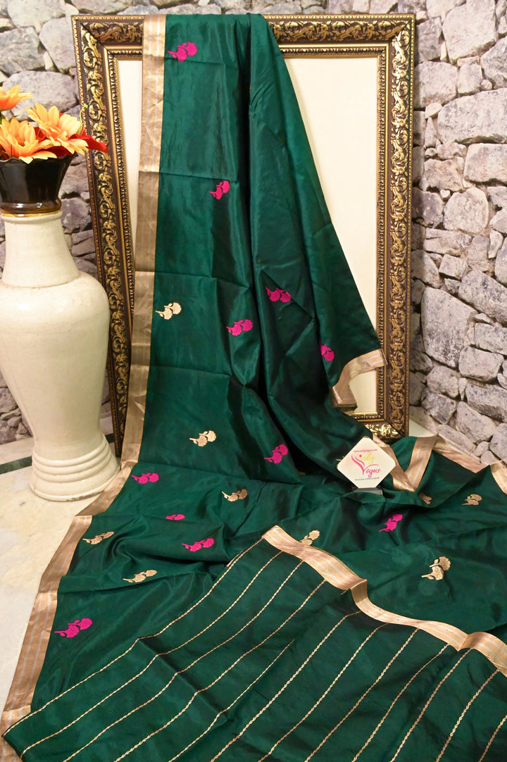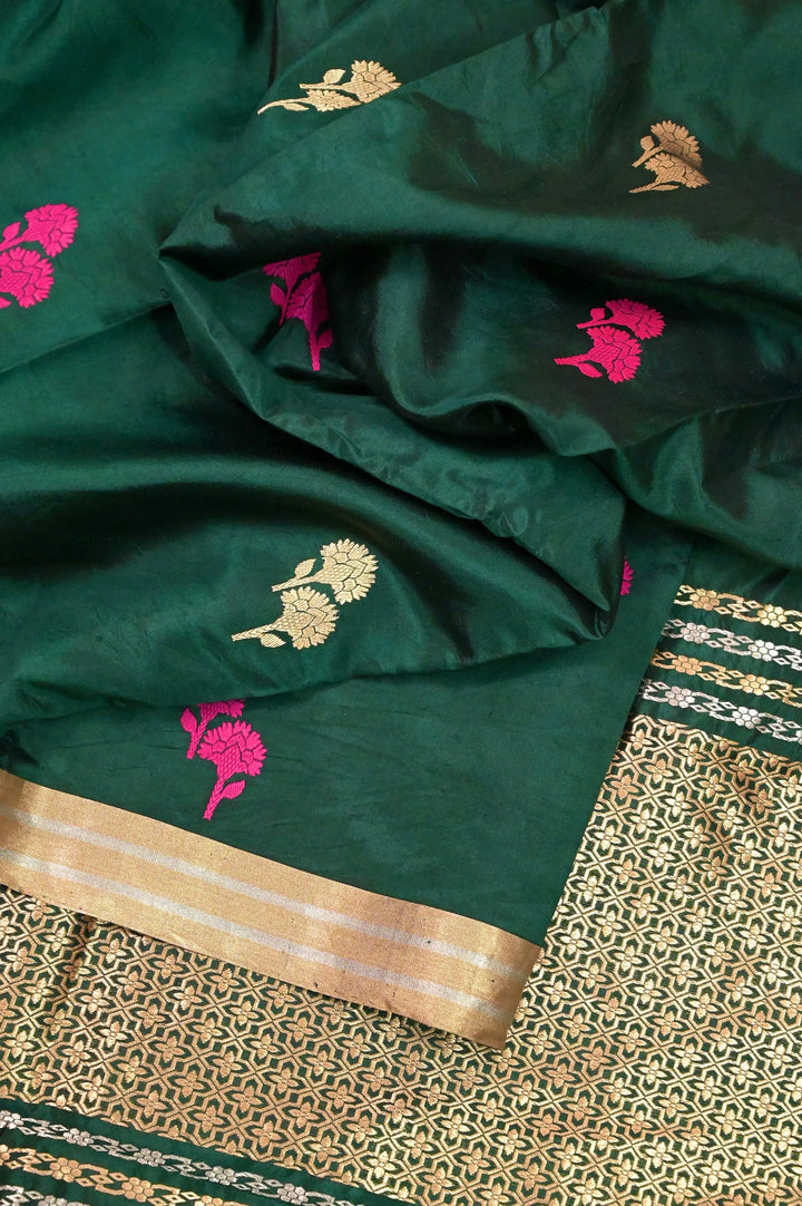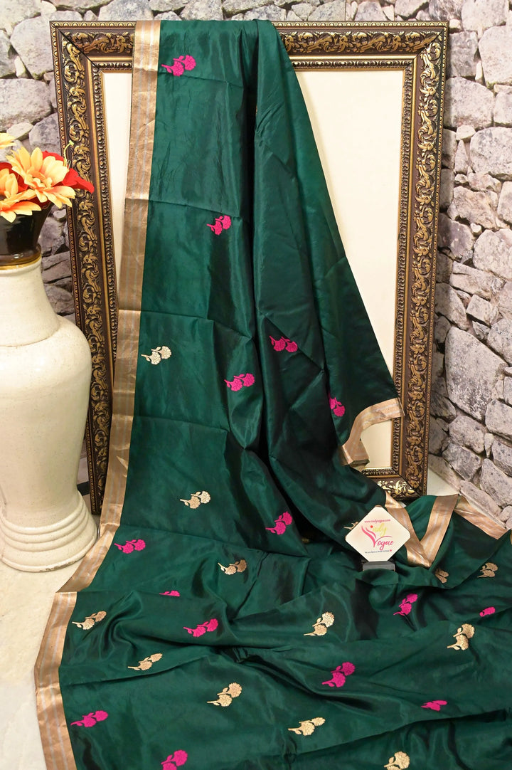 Pure Katan Banarasi Silk Saree in Bottle Green Color with Golden Zari Butta with Silver and Golden Zari Work Border and Pallu
