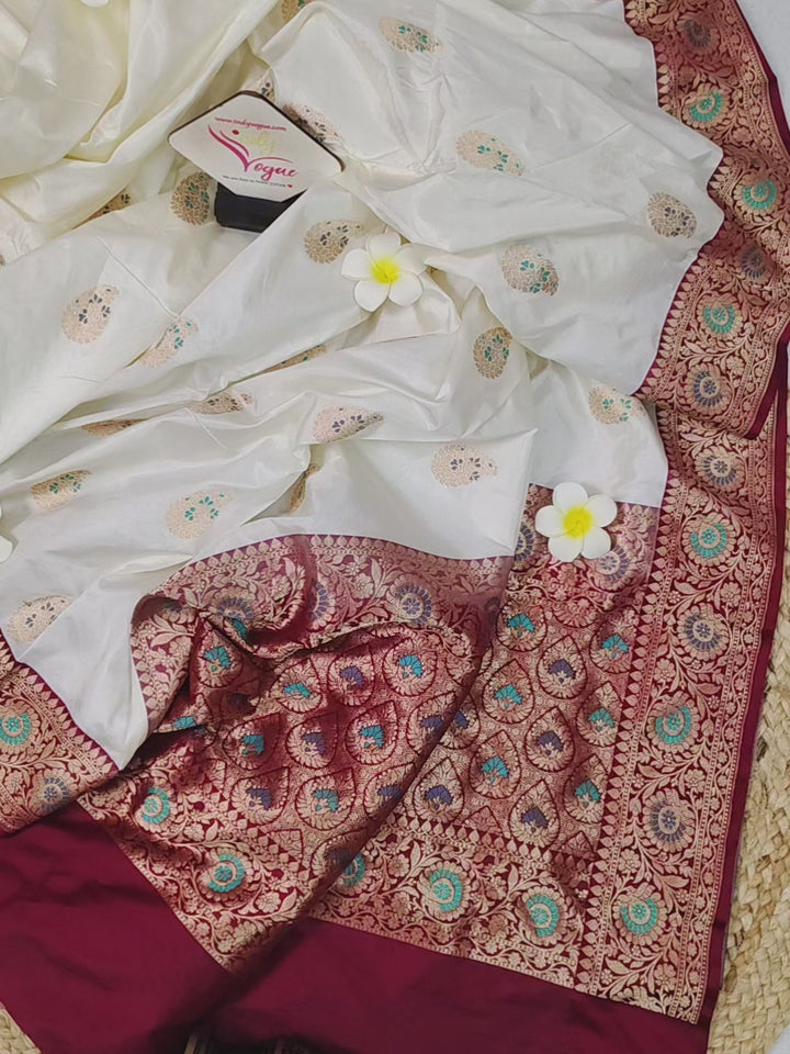 Wrapped in offwhite elegance, this Pure Katan Banarasi Silk Saree whispers luxury with every fold. Intricate Meenakari buti work dances across the body while a stunning maroon border and zari-adorned pallu steal the spotlight.