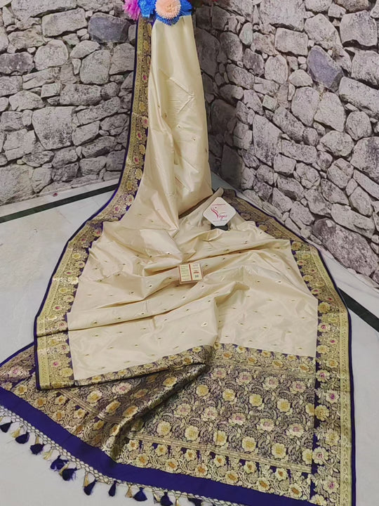 - Grand cream golden, and blue color silk mark certified Korial Banarasi fabric for timeless appeal