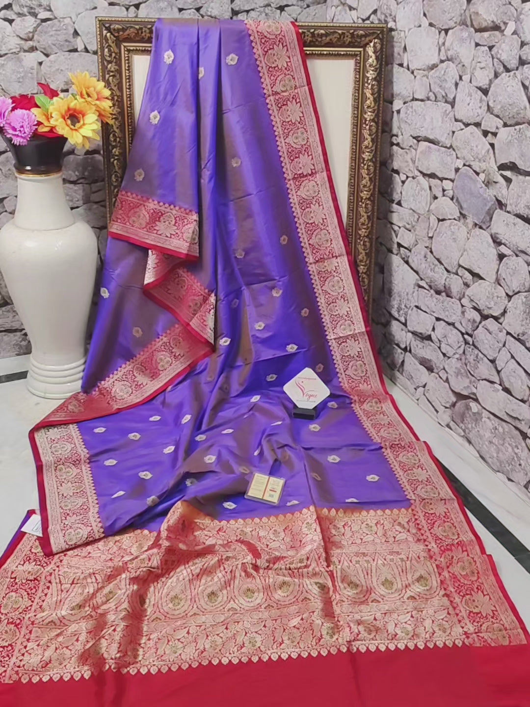 - Grand deep violet and yellow color dual-tone silk mark certified Korial Banarasi fabric for timeless appeal