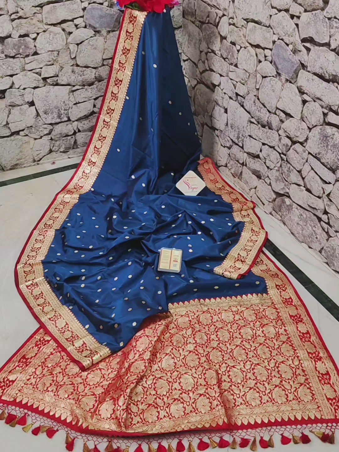 Slip into the dreamy charm of this Pure Korial Katan Banarasi Saree, awash in a gorgeous deep rama blue with a striking red pallu and border that create the perfect contrast. Soft as a whisper, yet undeniably regal, this saree weaves the ancient magic of pure kadhua craftsmanship into every thread.