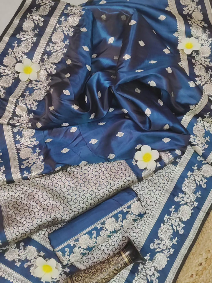 Pure Mashru Banarasi Silk Saree in Rama Blue Color with Allover Silver Zari Butta with Dual Tone Double Border