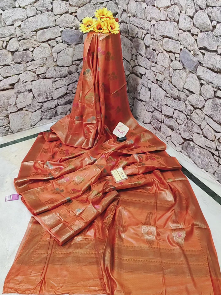Pure Muga Silk Saree in Fire Orange Color with Allover Meenakari and Golden Zari Work