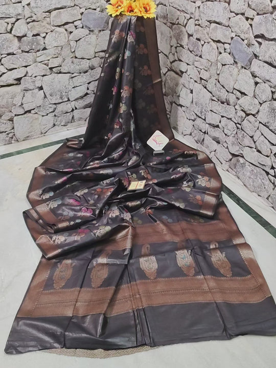 - Intricate antique golden zari with meenakari floral buta work on the body and pallu all over