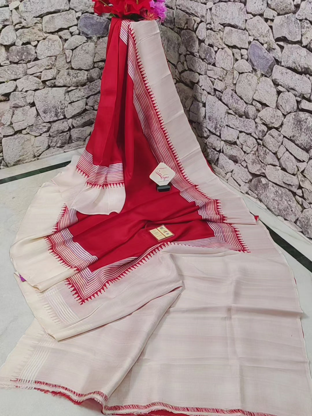Pure Murshidabad Silk Saree in Red and Offwhite with Hand Block Print Work