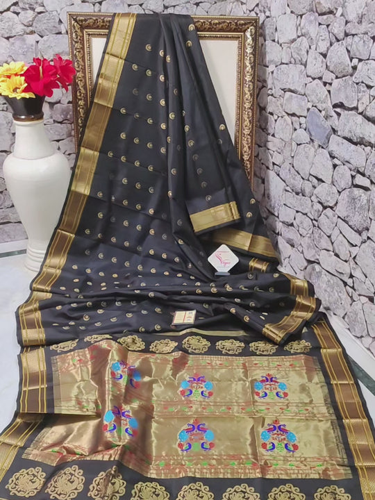 Pure Paithani Silk Saree in Charcoal Black Color Dual Tone with Allover Golden Zari Chand Butta
