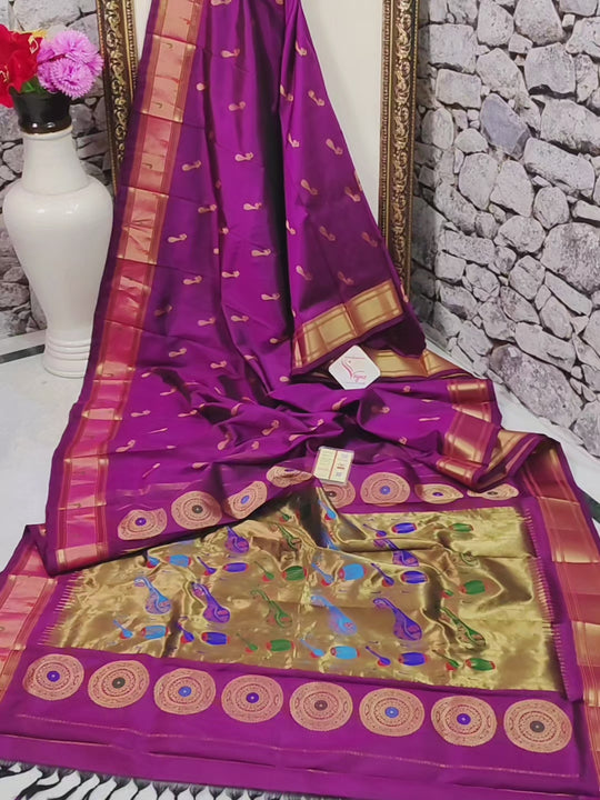 Pure Paithani Silk Saree in Deep Magenta Color with Munia Motif Border and Pallu