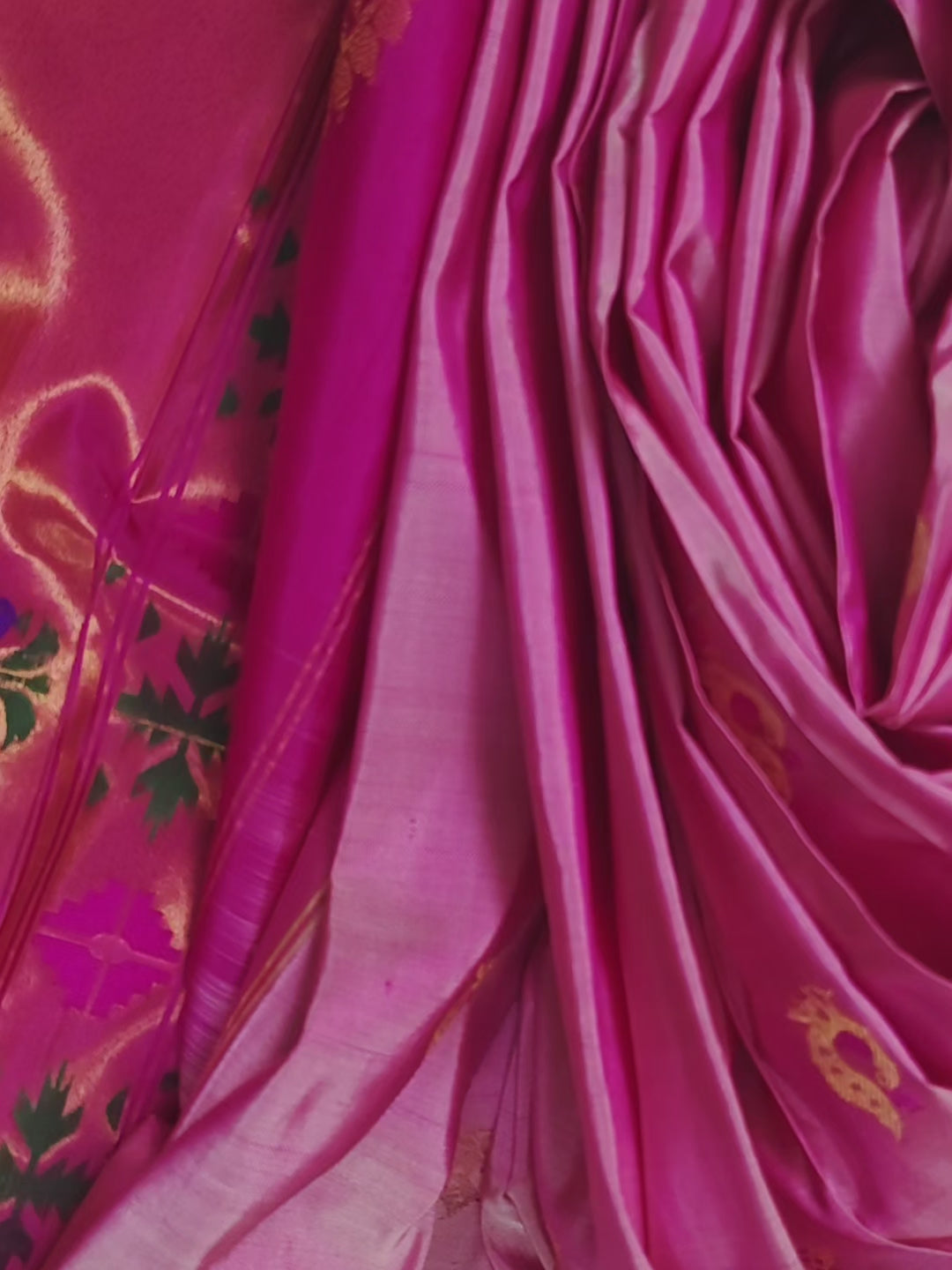 The vibrant contrast zari border and pallu adds a touch of grandeur, while the magnificent peacock motif on the pallu, crafted in the traditional Paithani style, brings the drape to life with its detailed artistry and gleaming zari.