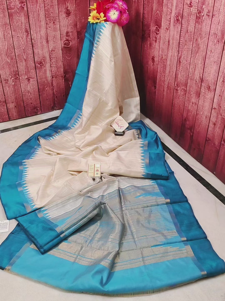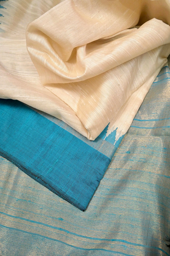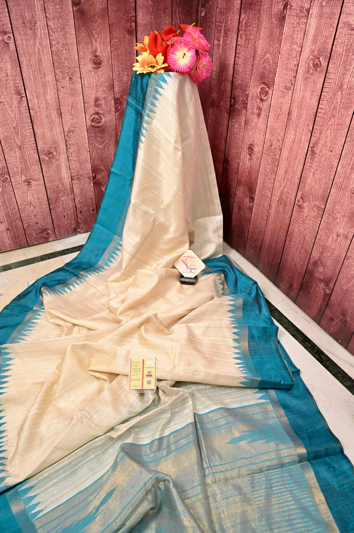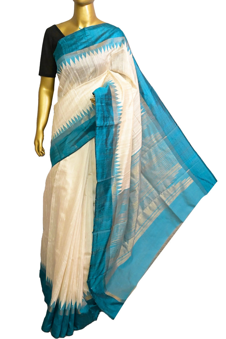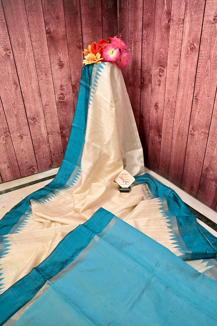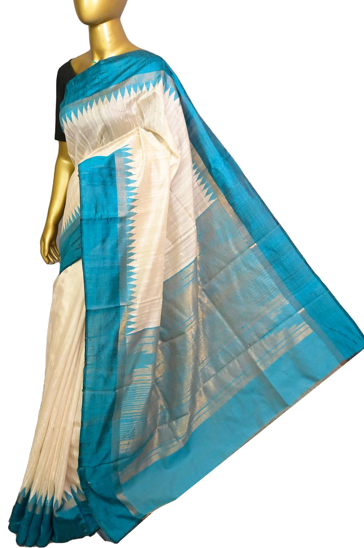 Pure Raw Silk Saree in Offwhite and Cyan Blue Color with Contrast Color Temple Border and Zari Check Pallu