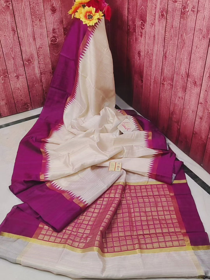 Pure Raw Silk Saree in Offwhite and Dark Purple Color with Contrast Color Temple Border and Zari Check Pallu