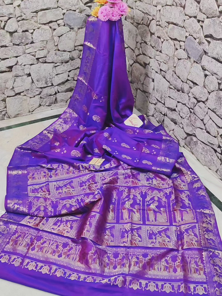 What sets this beauty apart are the detailed designs telling stories of divine weddings and lively dancing girls, weaving tradition and culture into every strand. The vibrant blue and magenta dual tone adds a punch of charm and elegance, making it your go-to for weddings, festivals, or those unforgettable family celebrations.