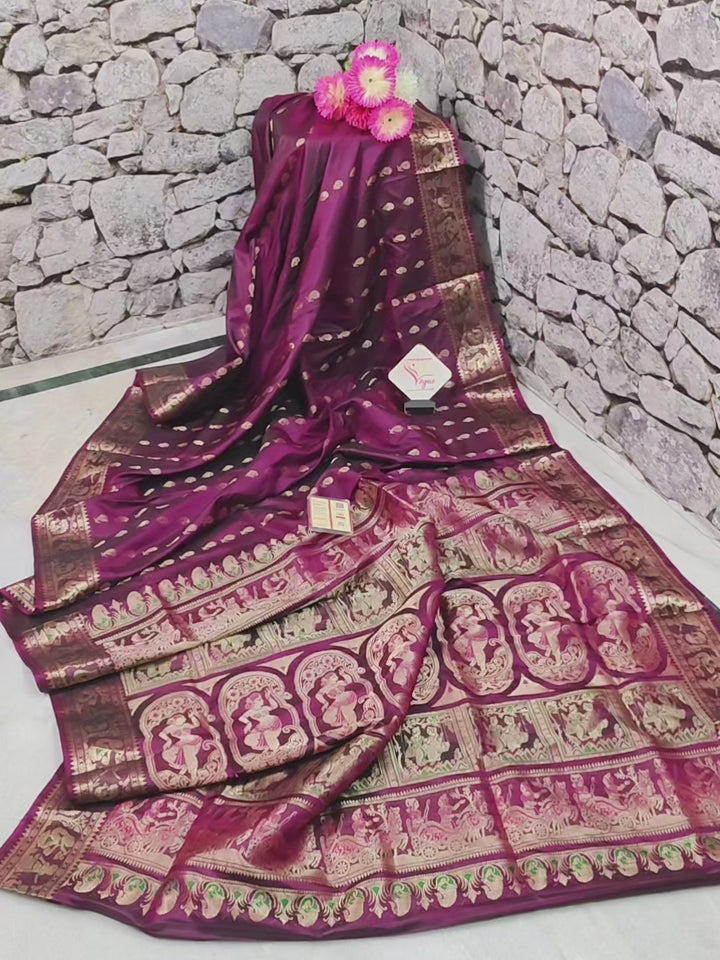 - Intricate meenakari work on the body in the form of hazaar (thousand) butta or paisley, and on the pallu and the border, where the work depicts traditional baluchari folk tale motifs and patterns, like this one depicts the divine marriage themes with dancing girls all around