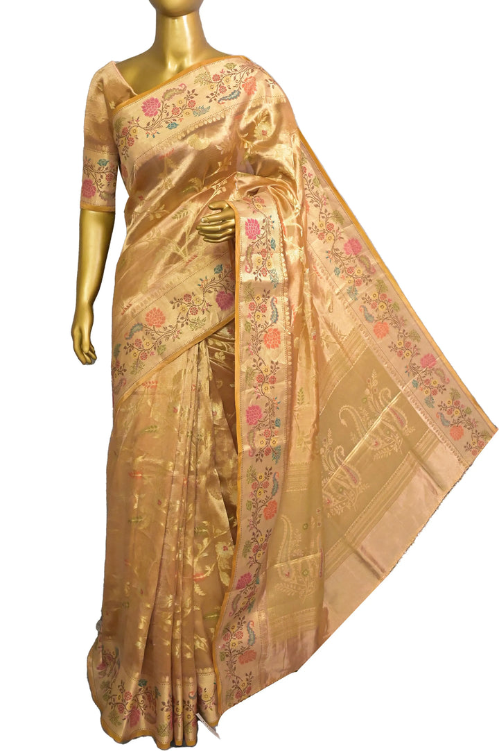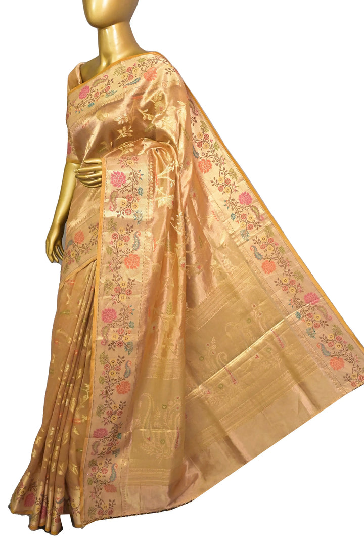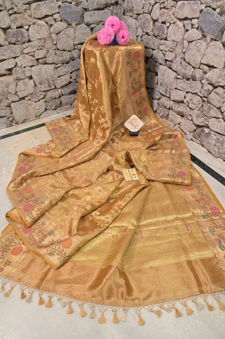 Pure Tissue Kota Banarasi Silk Saree in Mustard Yellow and Gold Color with allover Meenakari Jaal Weaving and Paithani Style Border