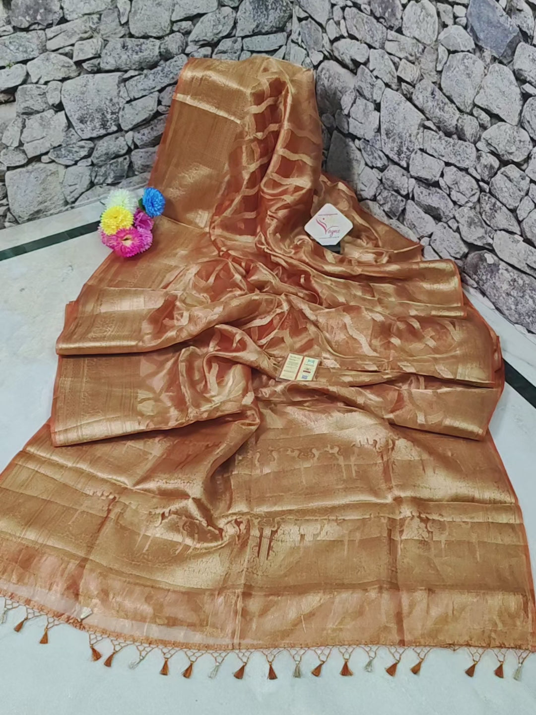 Discover the charm of this Pure Tissue Silk Saree in a beautiful golden orange color. Its classic Leheriya pattern flows gracefully throughout, giving it an elegant and timeless appeal you'll love to wear.