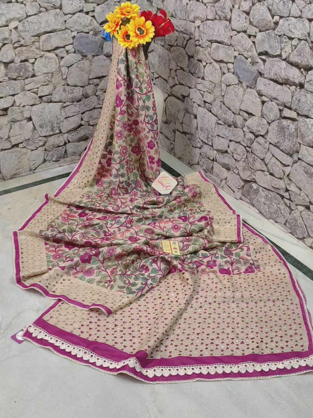The floral kalamkari hand print and mirror work provide a contemporary flair, while the pure tussar fabric ensures a comfortable yet elegant wear. Ideal for formal gatherings and festive celebrations.