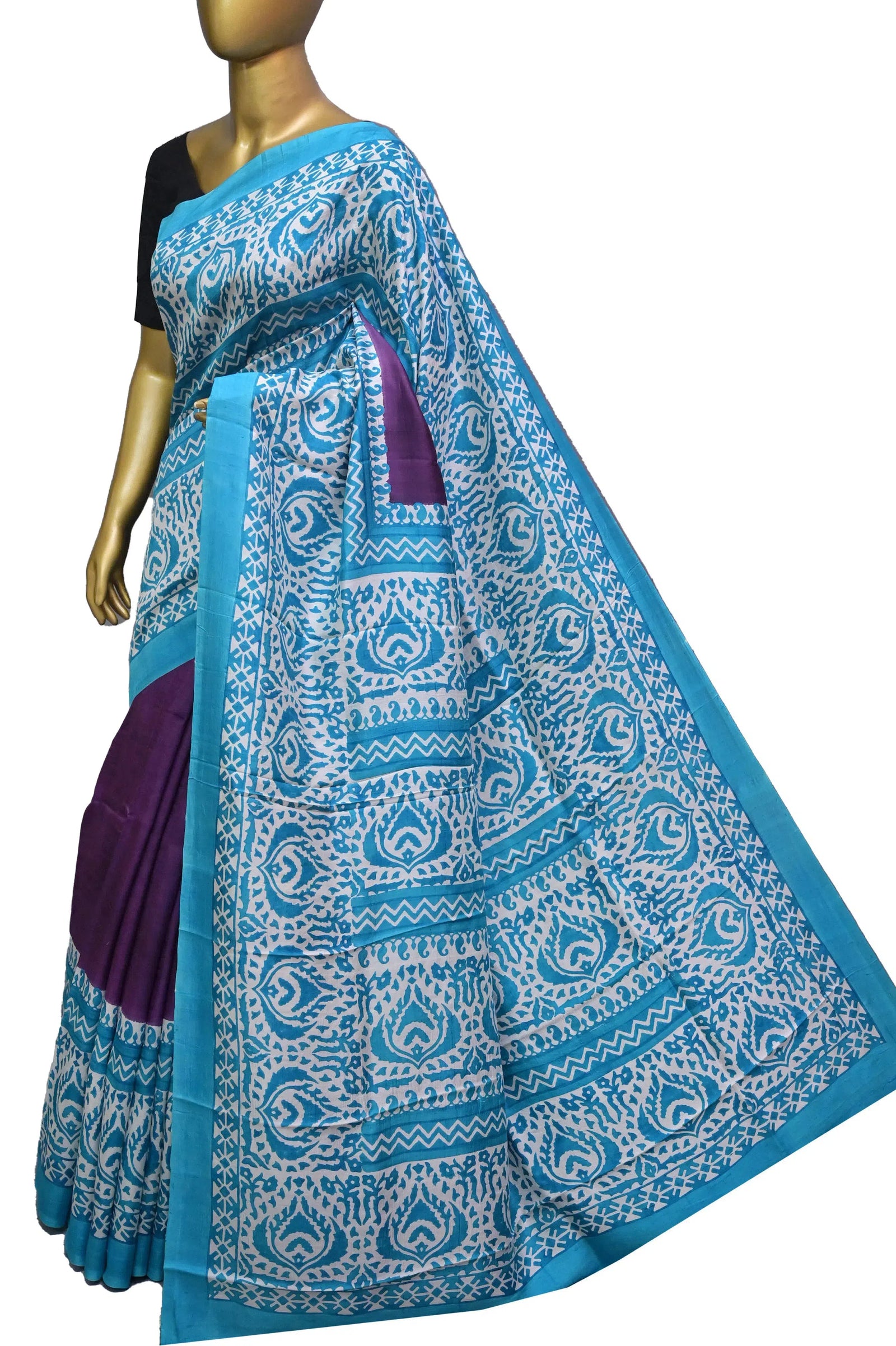 A purple and blue hand block print design on the body, along with the pallu and the border, fascinates this bishnupur silk among all-age buyers. Try out this fusion collection only with us.