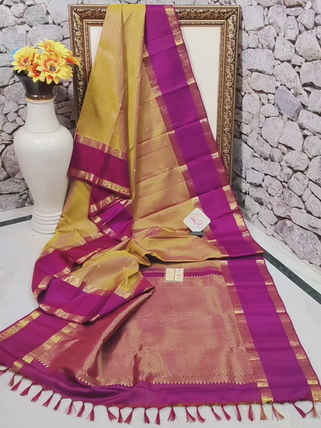 - The opulence of South Indian silk variety in purple and dijon yellow dual tone color.