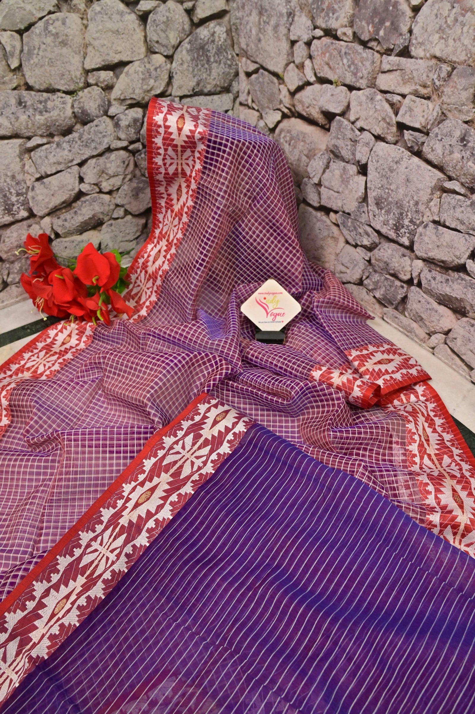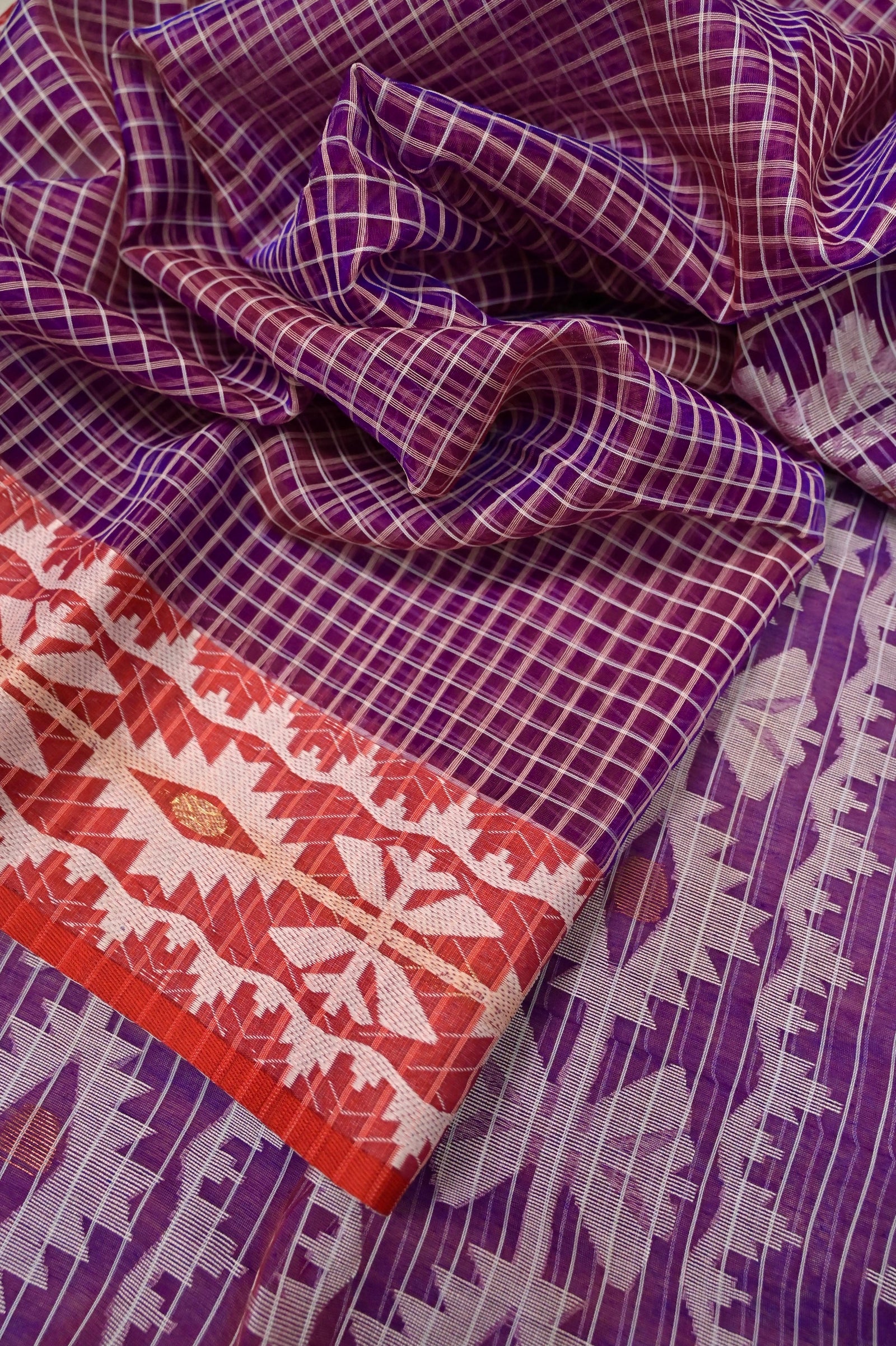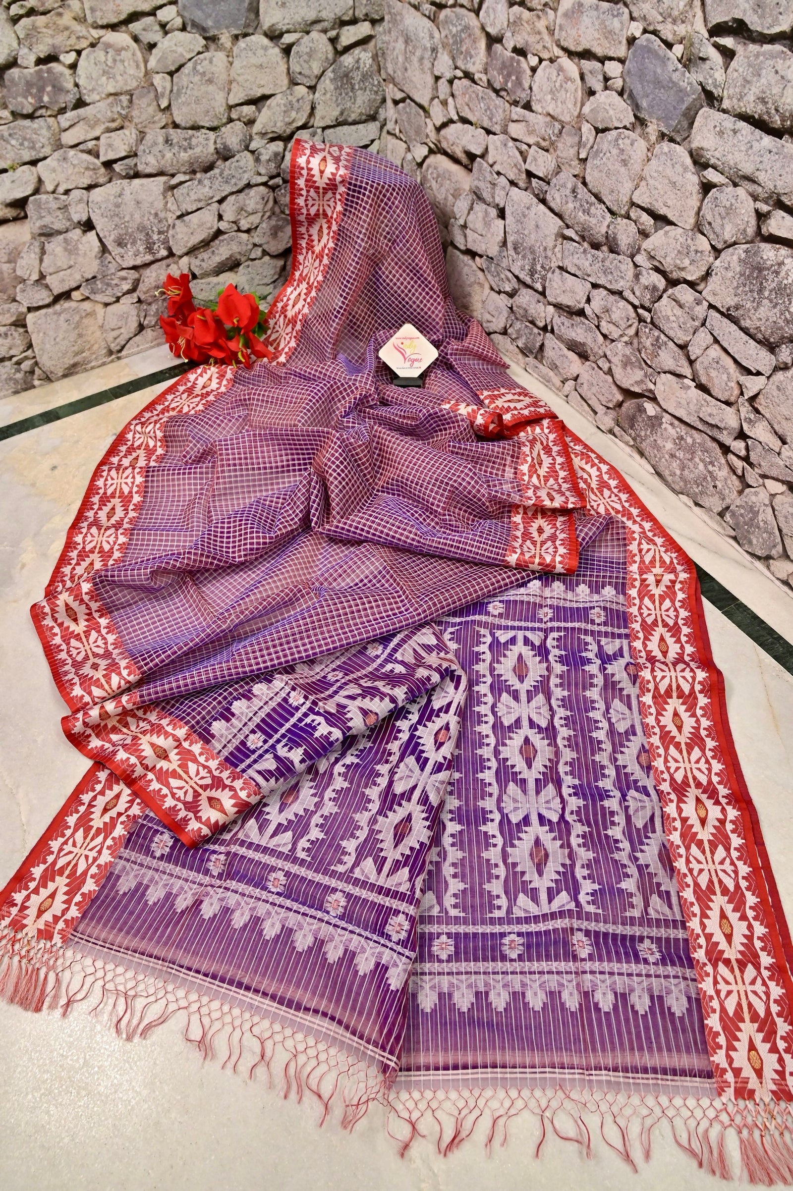 Purple and Red Dual Tone Muslin Handloom Saree with Gamcha Check Design