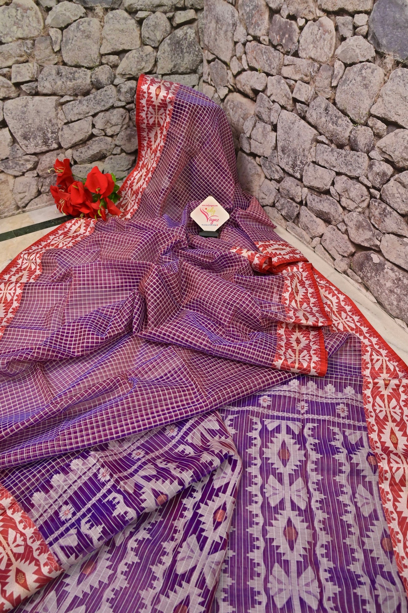 Prepare to catch some eyes with our muslin handloom saree with purple and red dual-tone, with a unique Gamcha Check Design! Featuring detailed jamdani weaving on the border and pallu, this saree is perfect for those who like a fun take on classic styles.