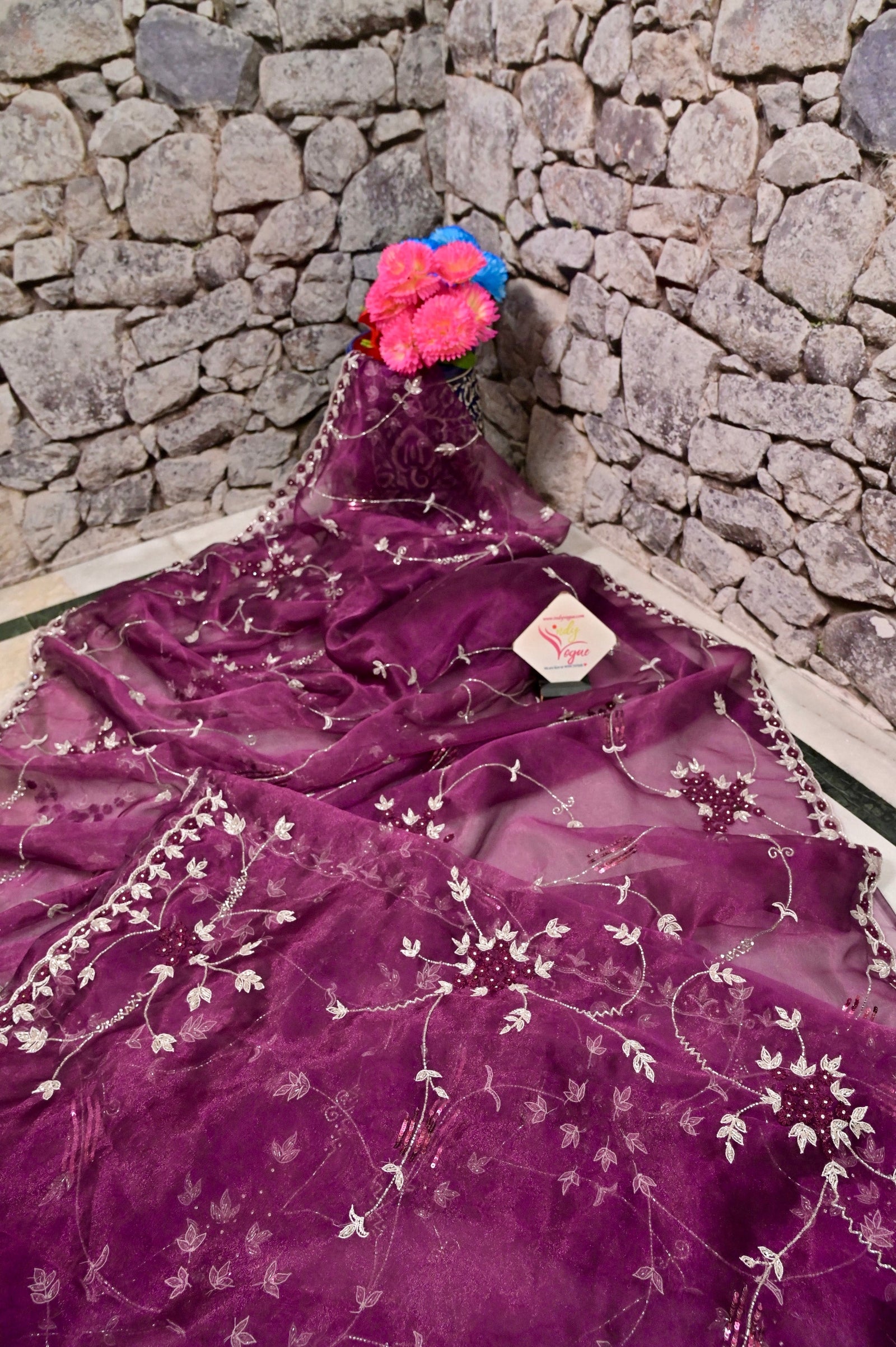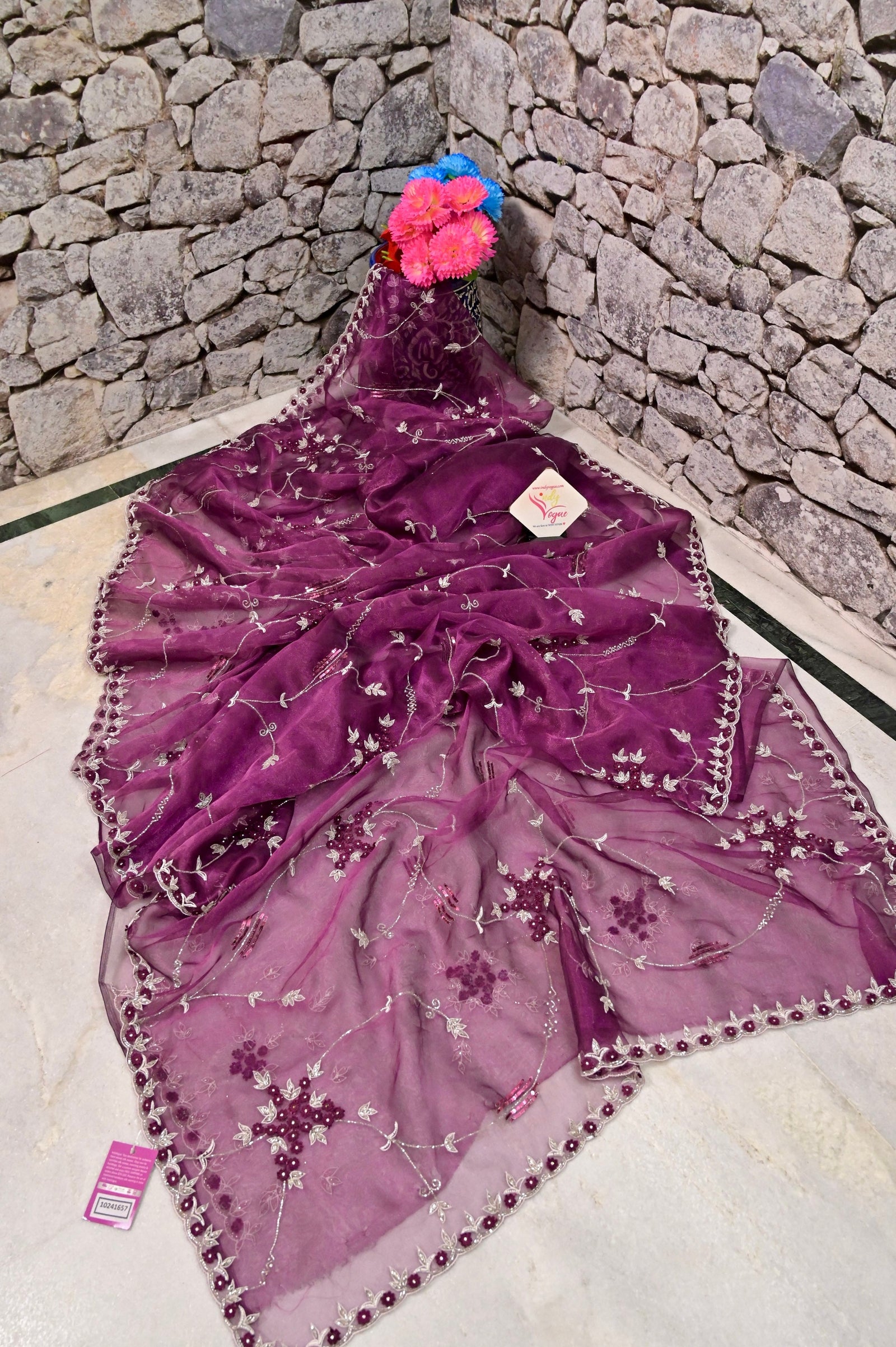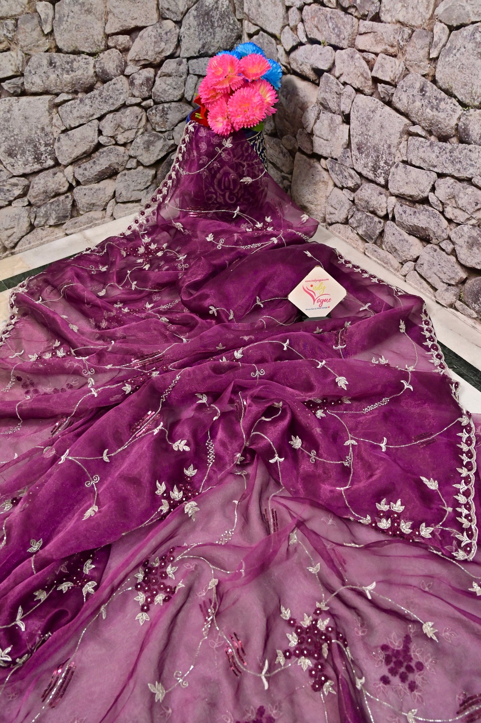 Purple color Glass Tissue Silk Saree with Hand Embroidery and Stone Work
