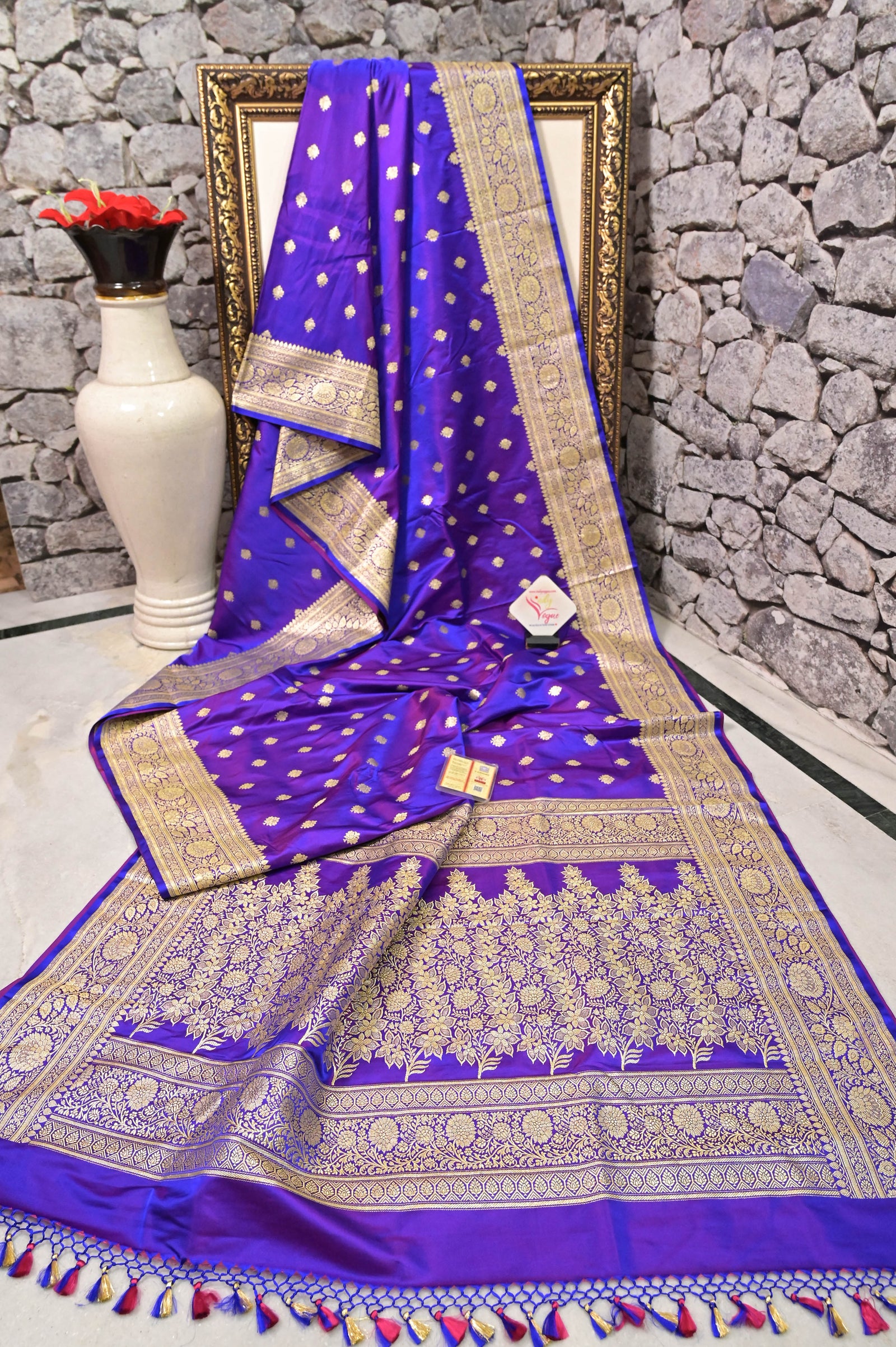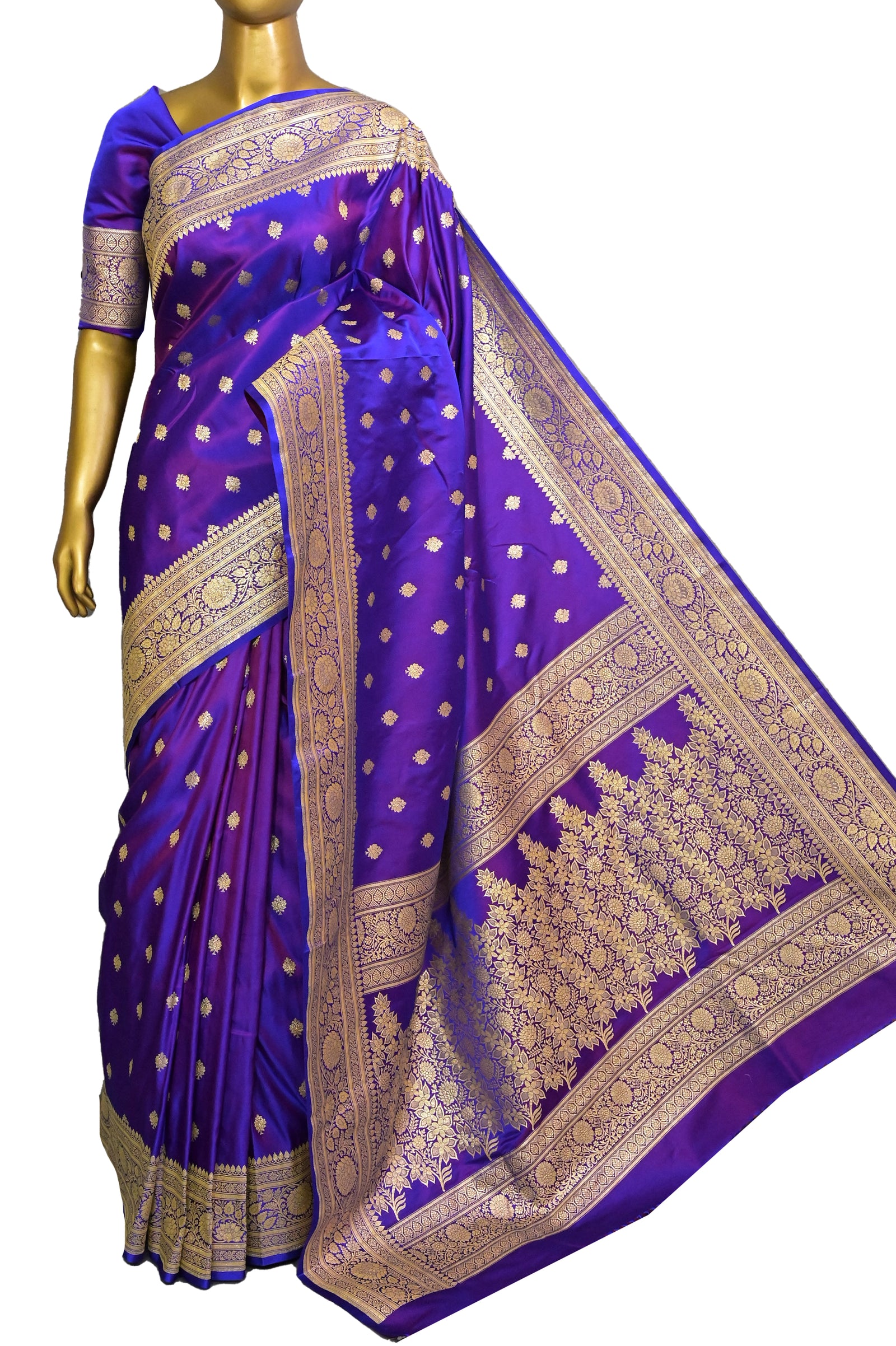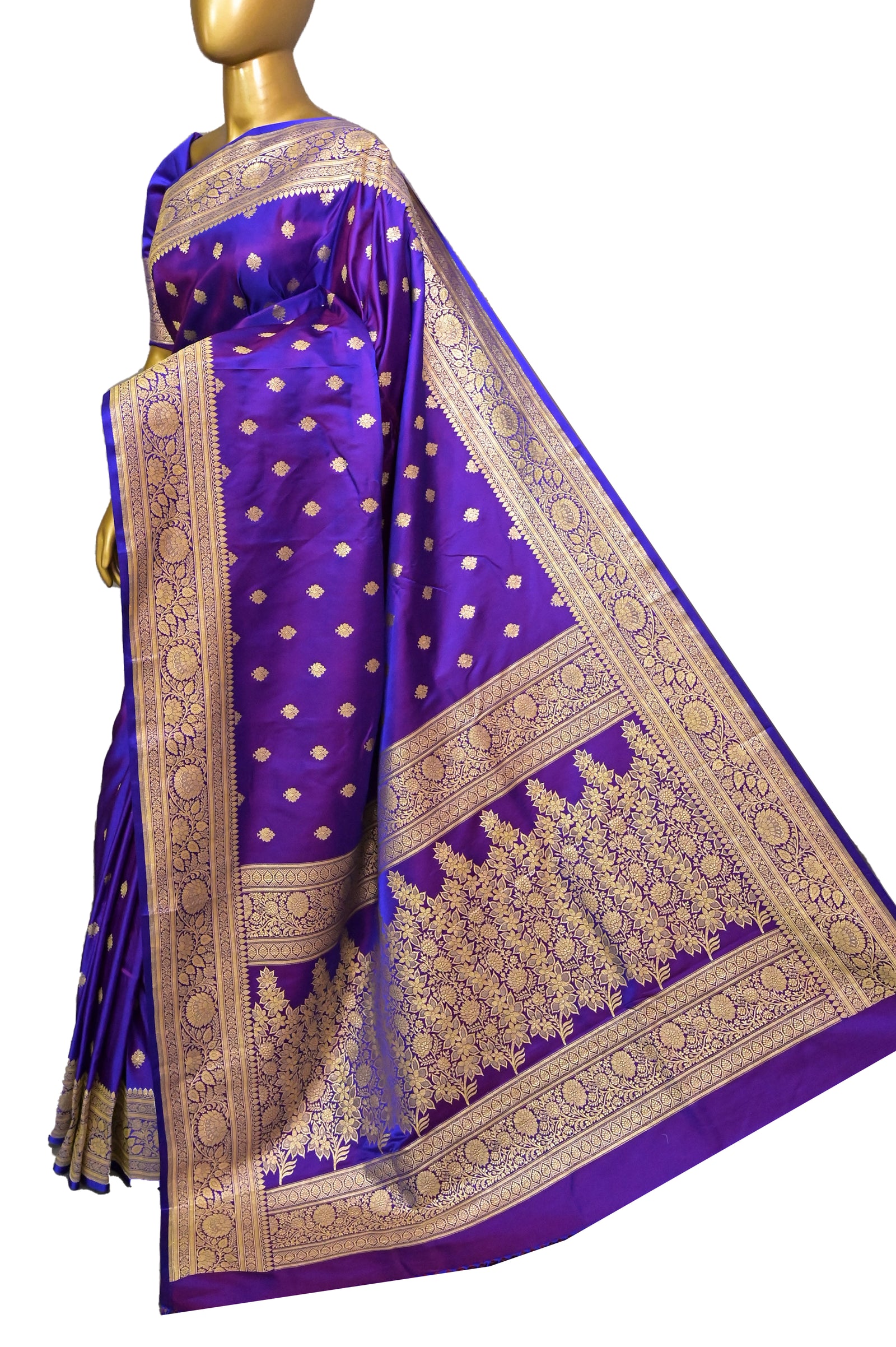 - This is a purplish blue color saree with golden zari work all over, with paisley style buti work all over the body