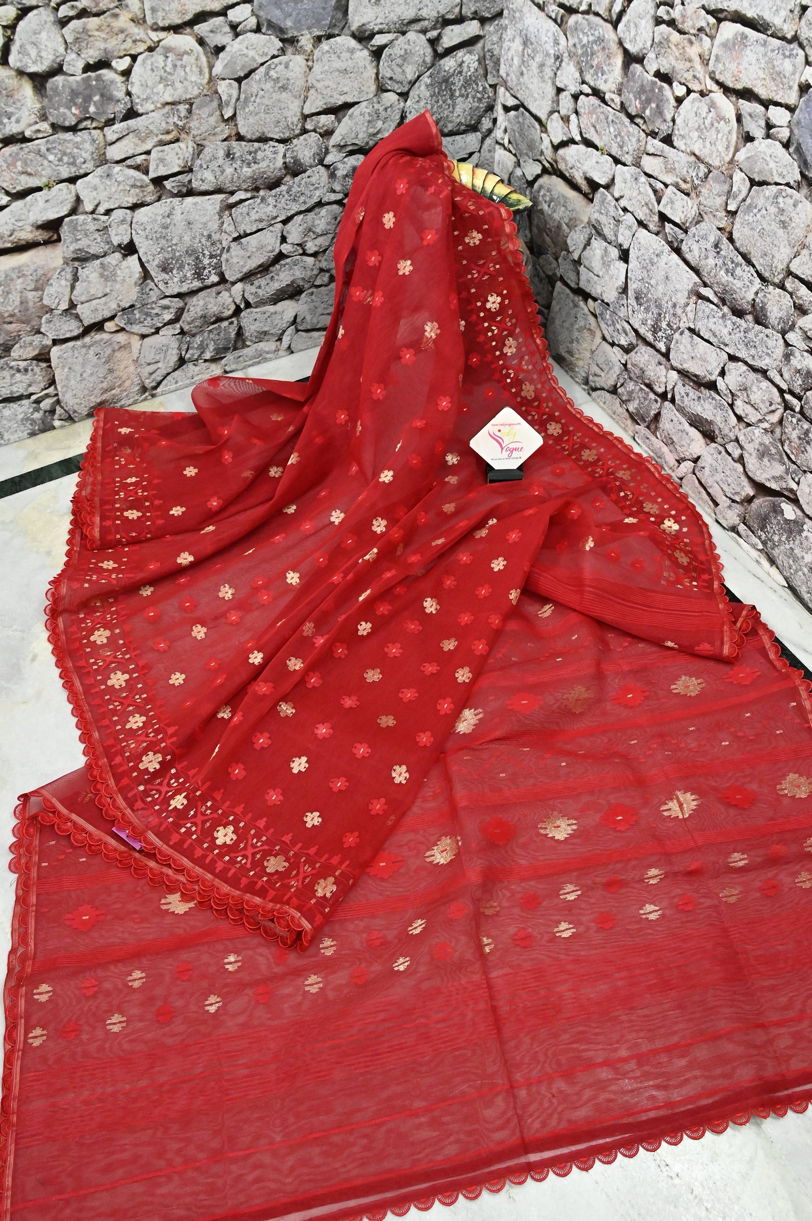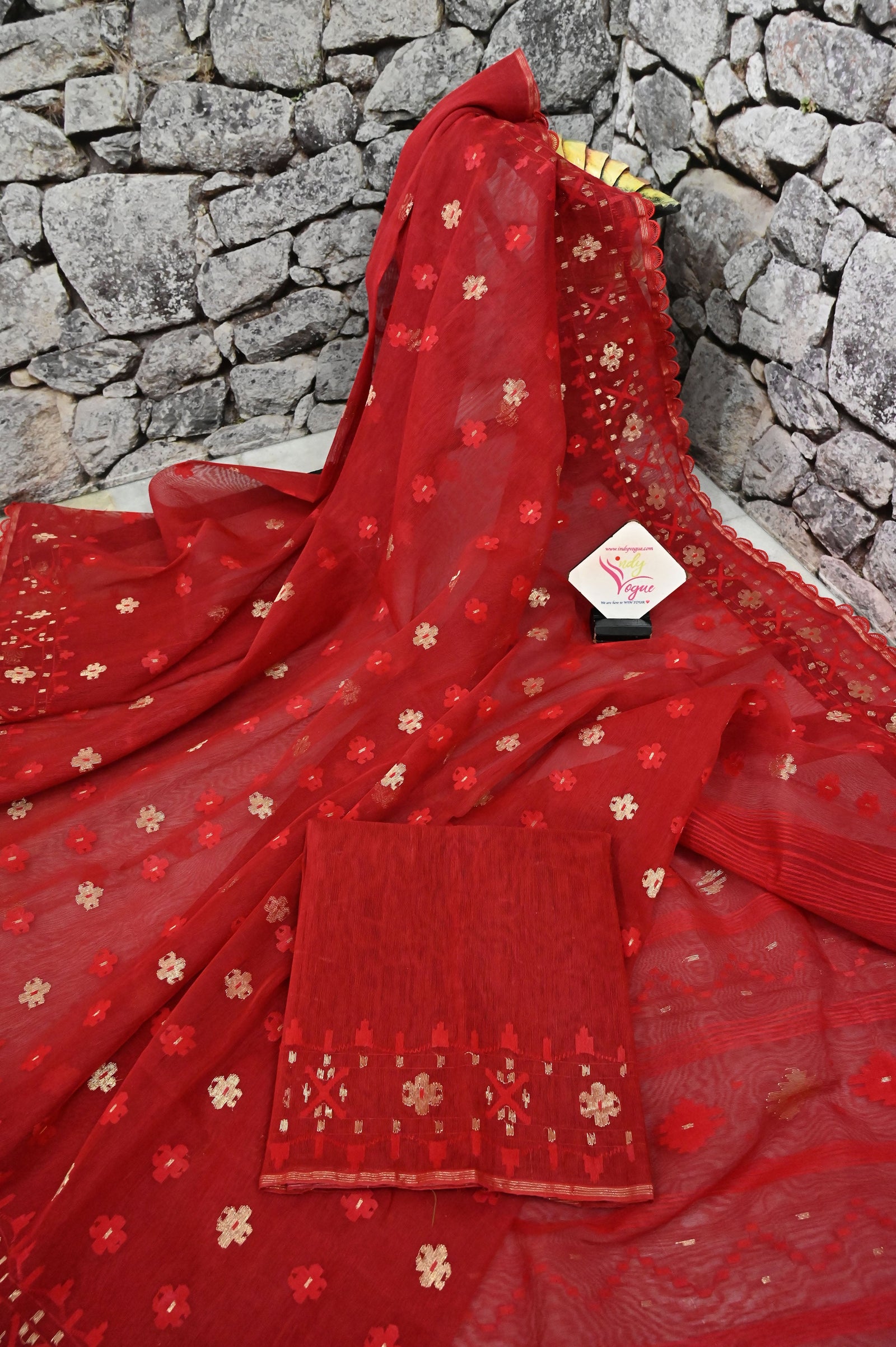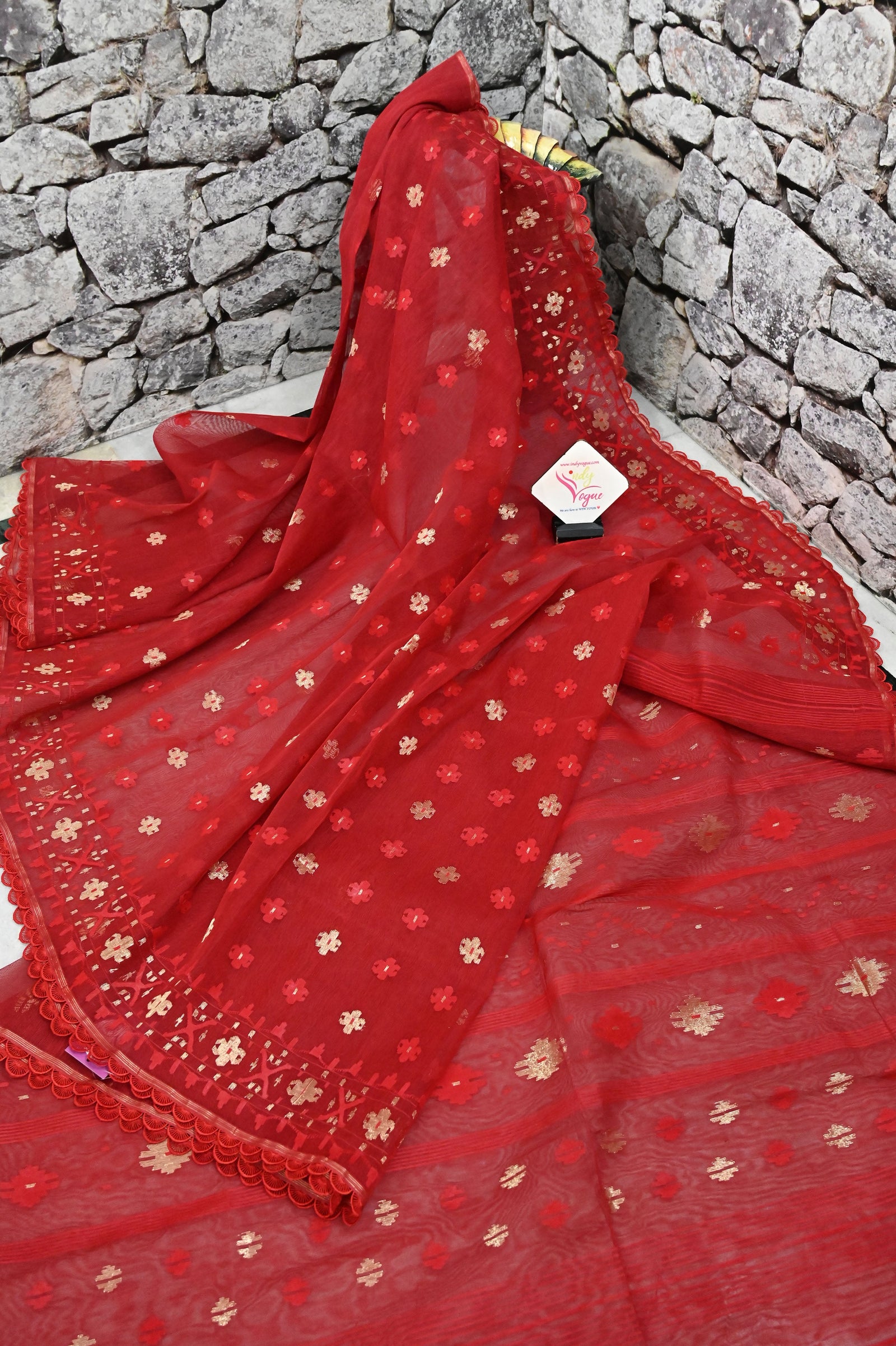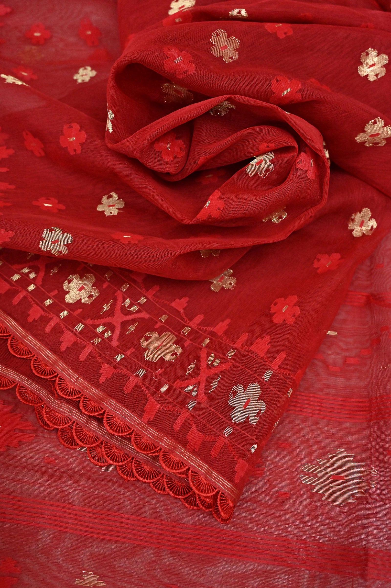 The amazing take on the traditional jamdani weave - a red color combination of pure Bangladeshi dhakai jamdani with the retouch of the traditional self jamdani weaving on the pallu, body, and border to make this saree one of the classiest choices.