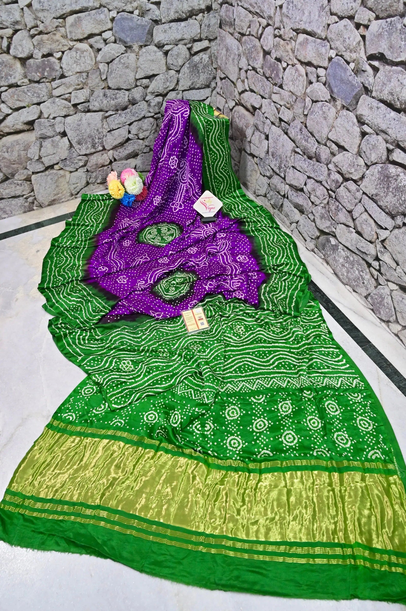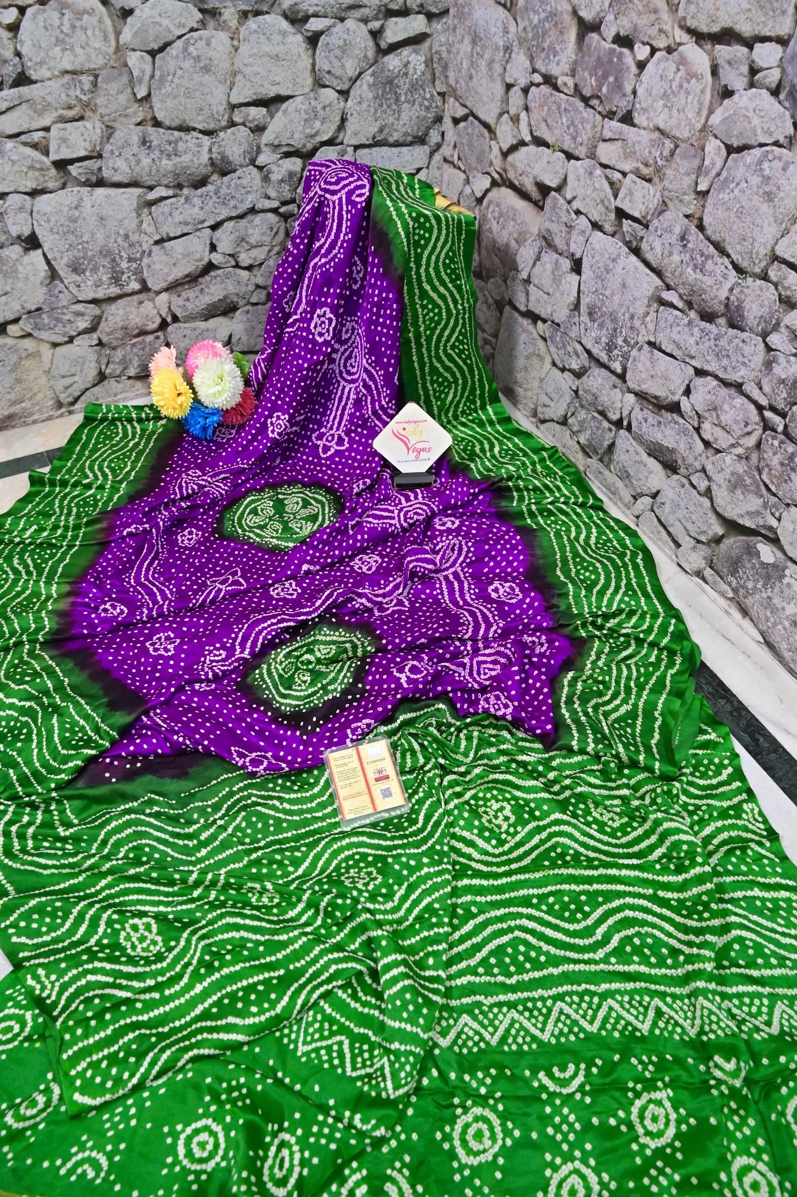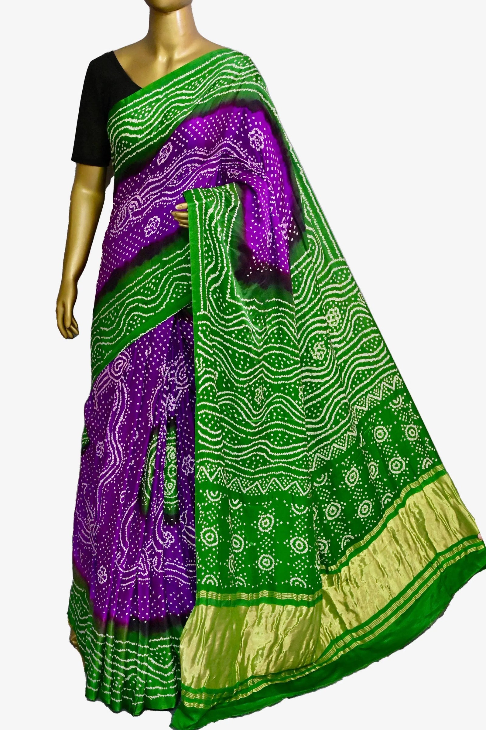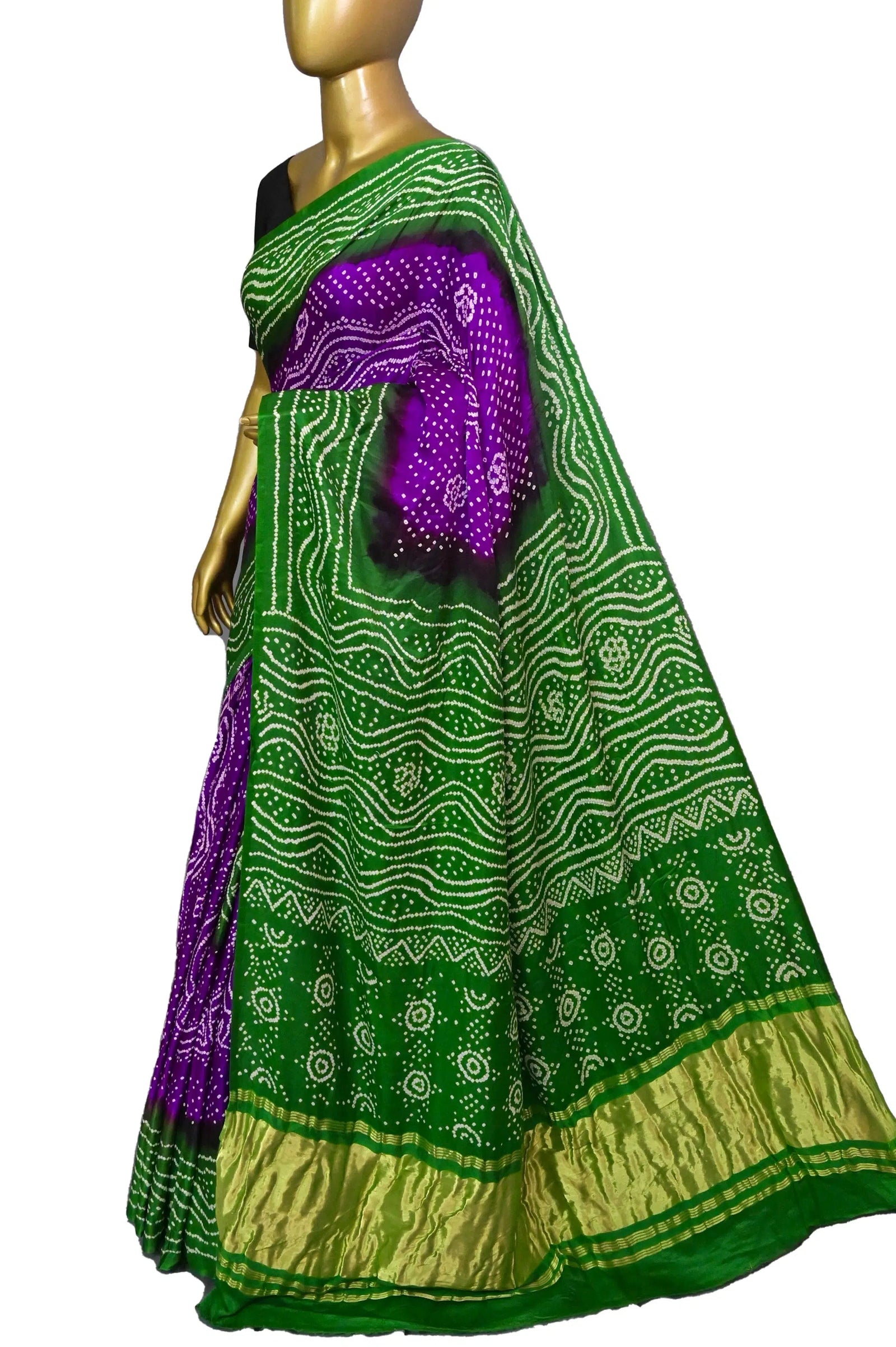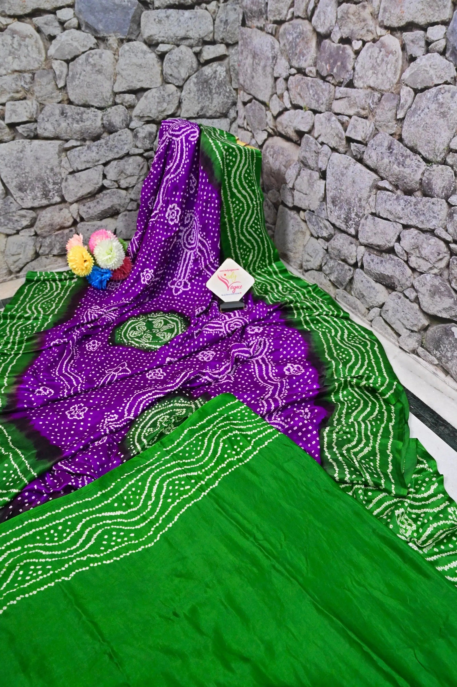 Rich Purple & Green Pure Ghazi Silk Rai Bandhej Saree in Traditional Chandra Design