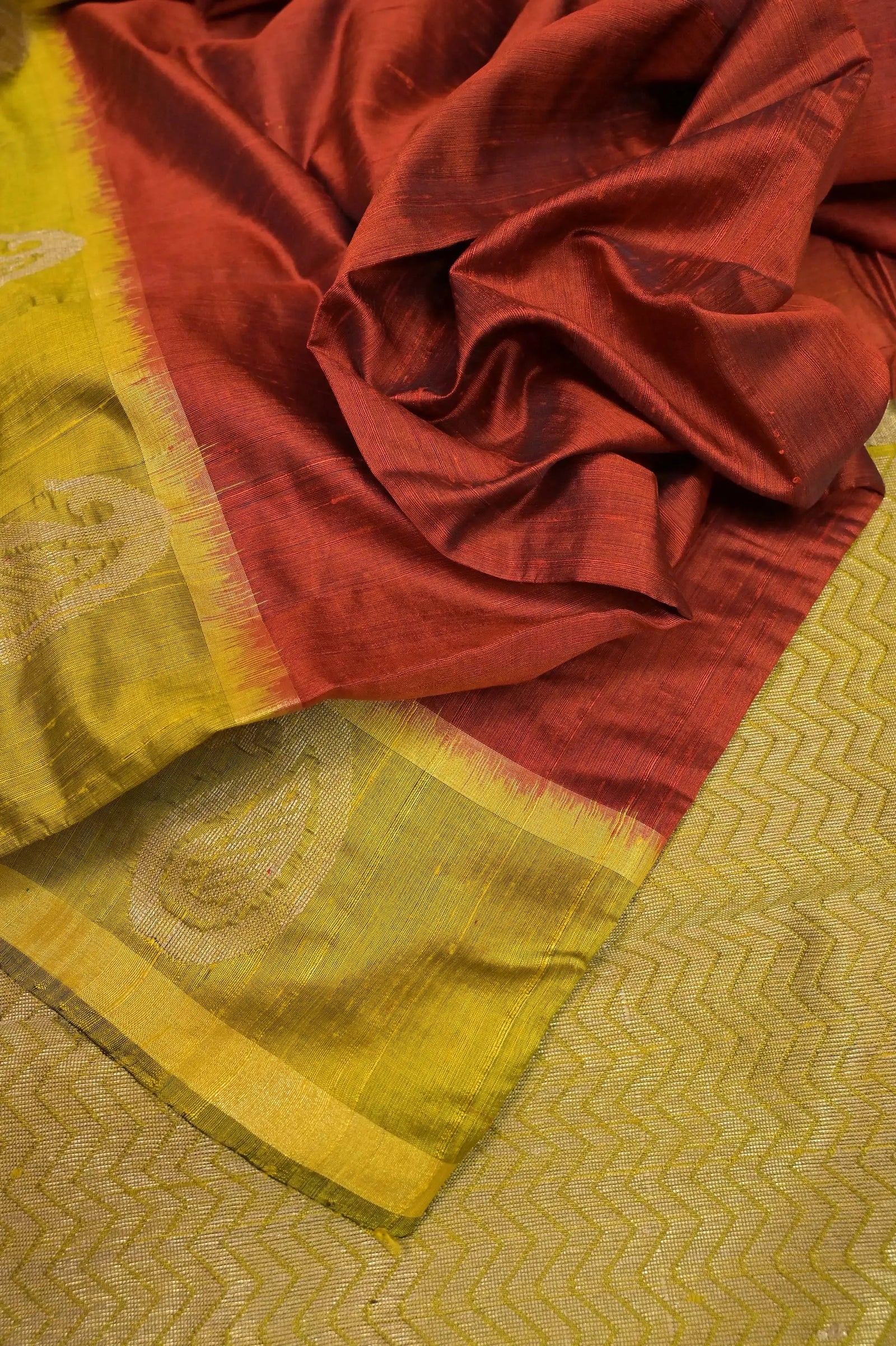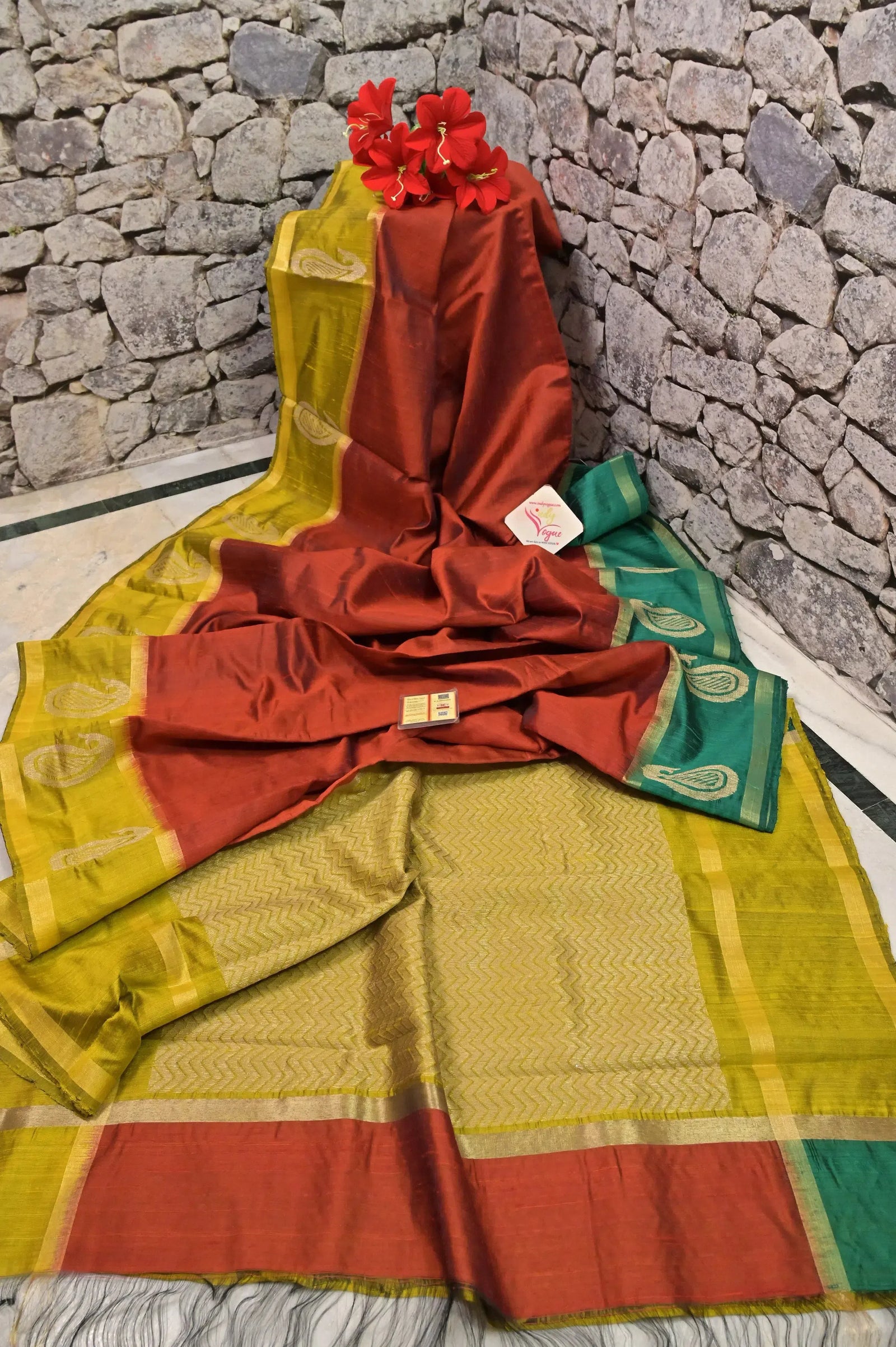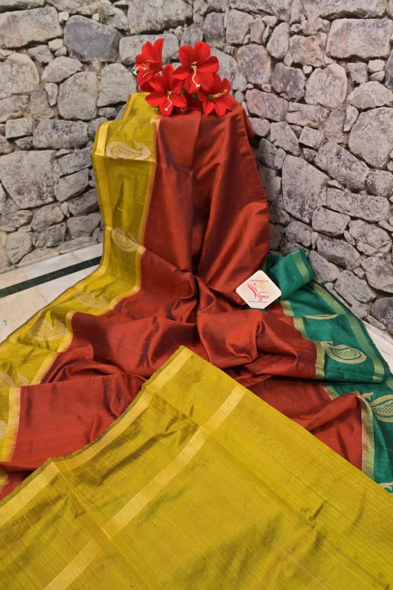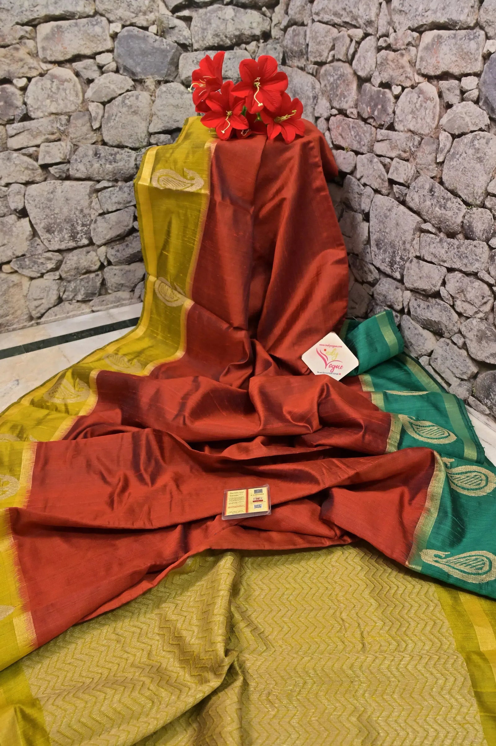 Rusty Orange Color Pure Raw Silk Saree with Ganga Jamuna Border