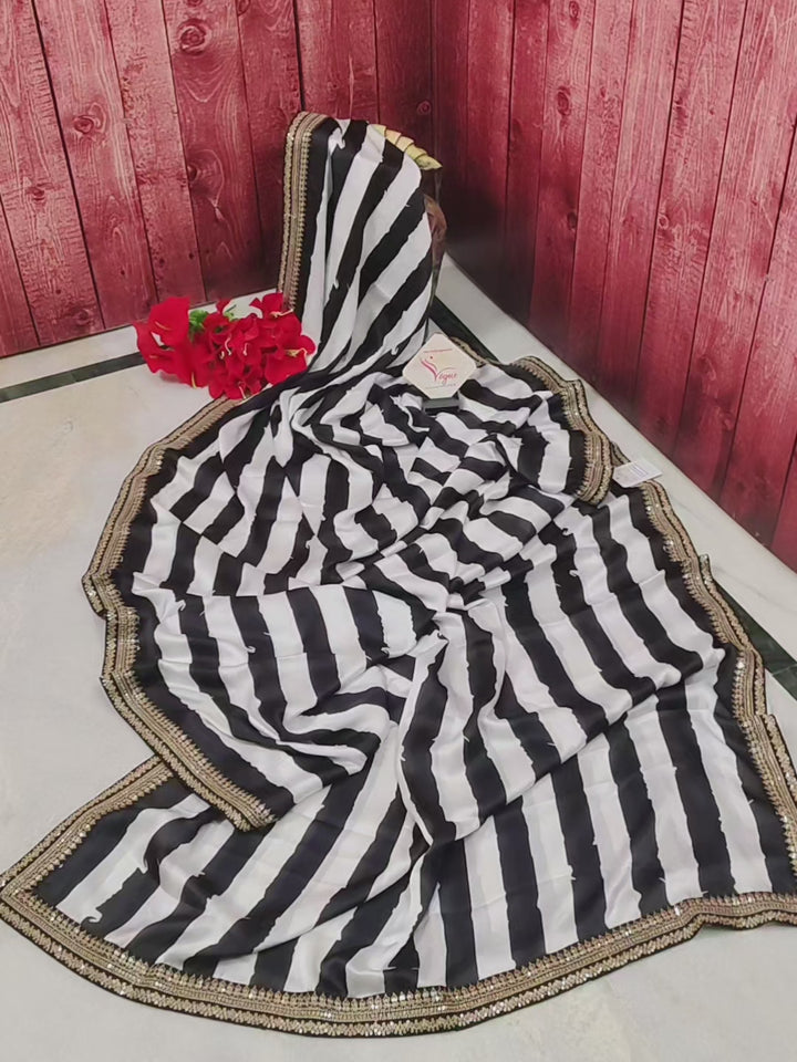 Satin Crepe Saree in White Color with Black Retro Stripes and Sequin Embroidery Border