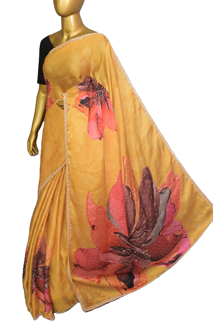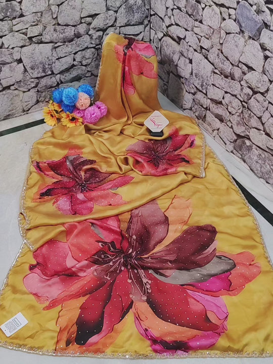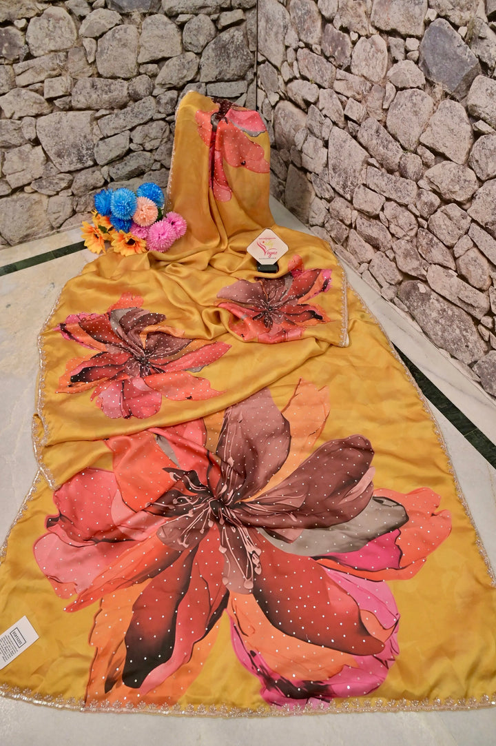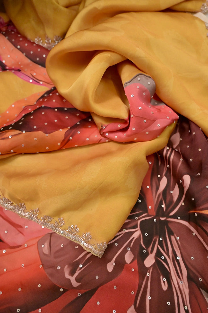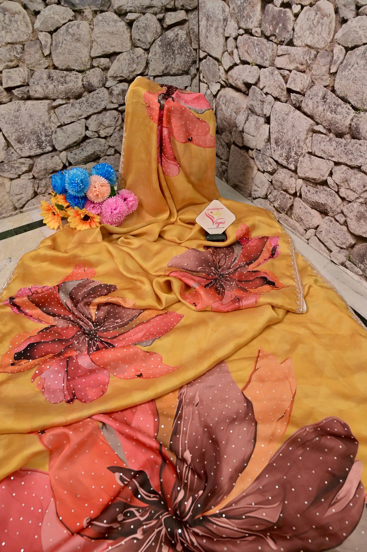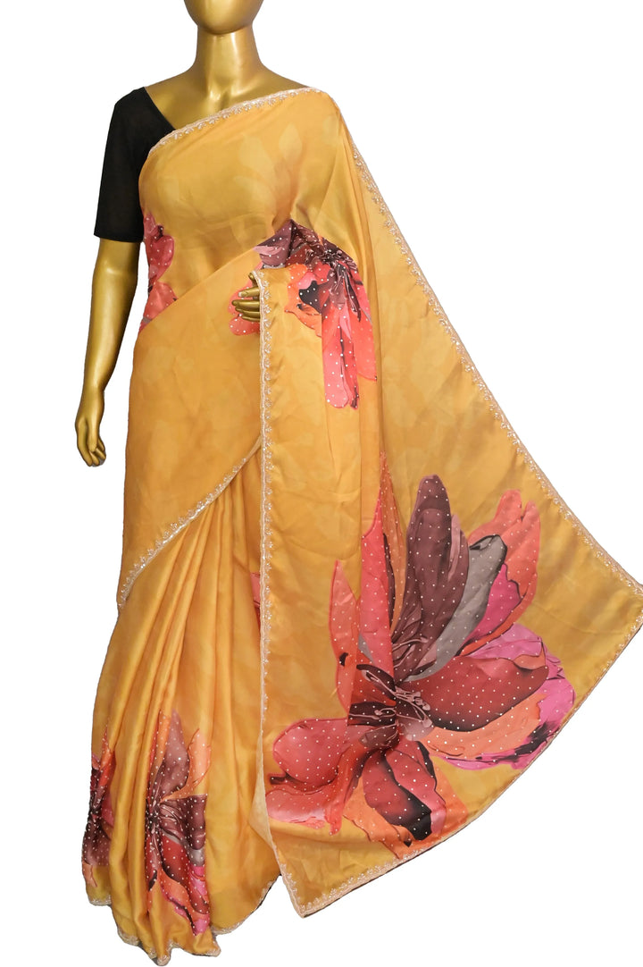 Satin Tissue Saree in Chrome Yellow Color with Floral Digital Print and Sequin Embroidery with Sequin Scallop Border