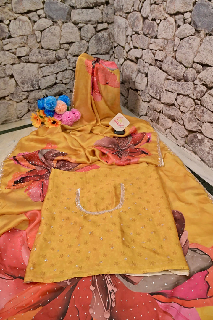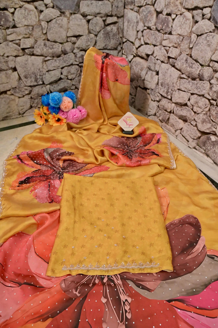 This Chrome Yellow Satin Tissue Saree is a walking bouquet with a dash of sparkle, perfect for those who love to make a statement. Crafted from silky-smooth fabric, it bursts to life with bold chrysanthemum digital prints that bring fresh, flirty garden party vibes with a glamorous twist.